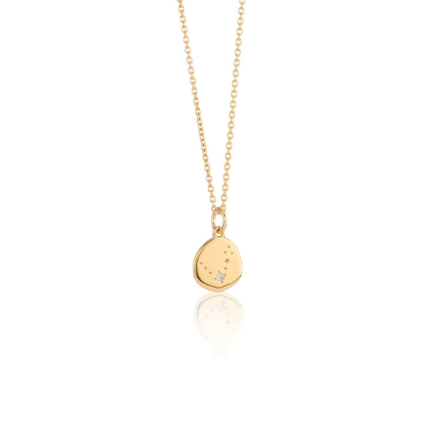 This pendant is crafted from 18ct gold vermeil and features precious gemstones that form the Pisces zodiac sign. The pendant hangs on a 16-18" adjustable trace chain and includes a gold star charm. The piece is made with recycled silver.