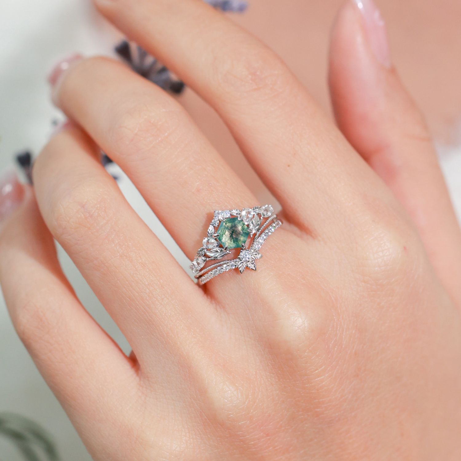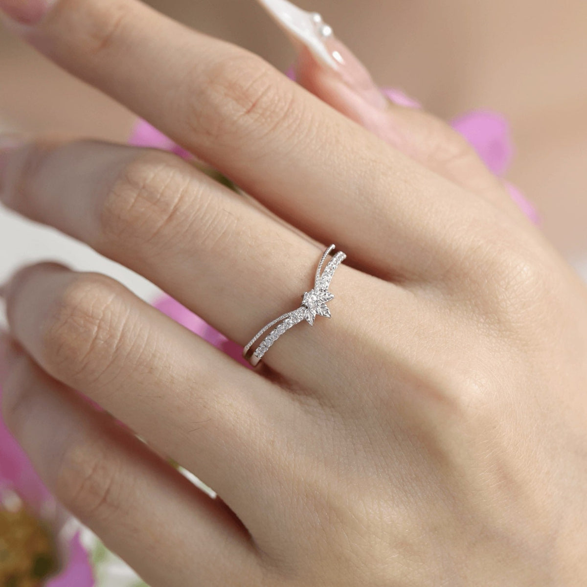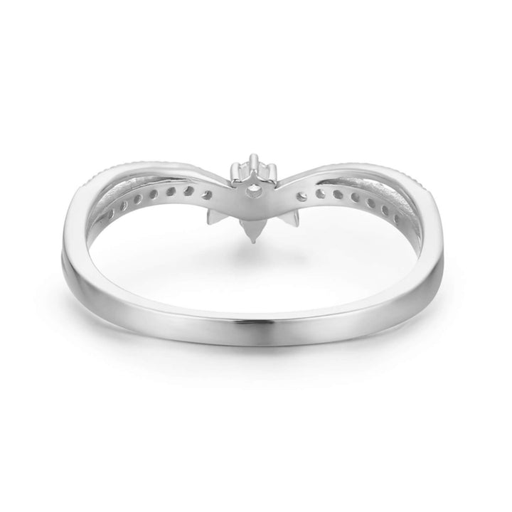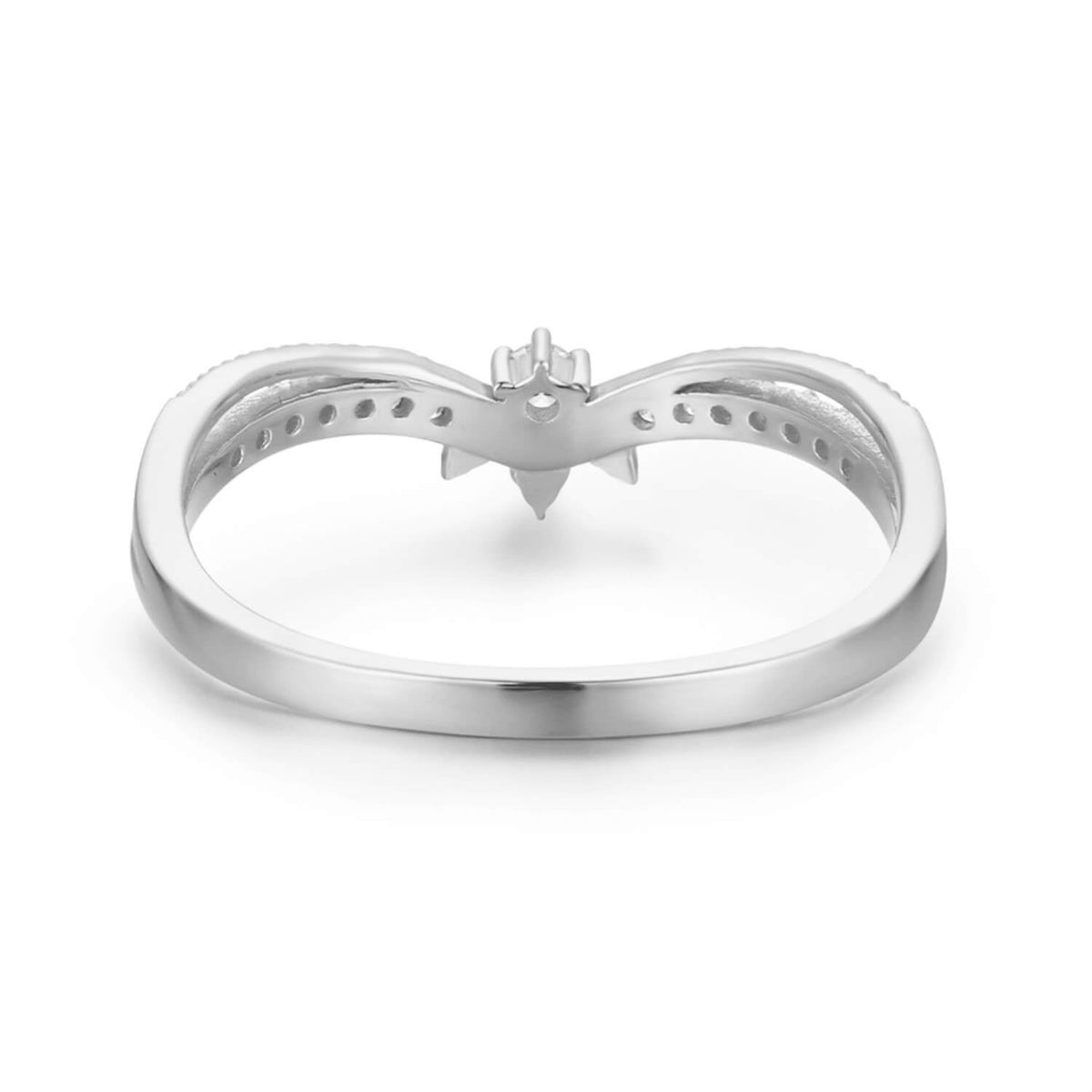 This ring is made from 10k solid white gold and features sparkling gems with a fan-shaped design.