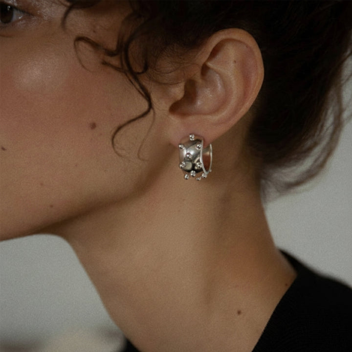 These Rivet Riot Huggie Earrings - Sterling Silver by Bad Without Reason are a unique and edgy accessory. They feature polished domes that orbit a thick silver band, giving a sense of armor rather than accessory. They are crafted in high-quality sterling silver with a blackened patina.