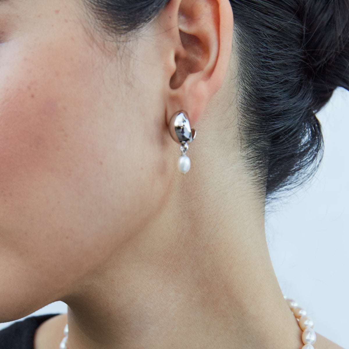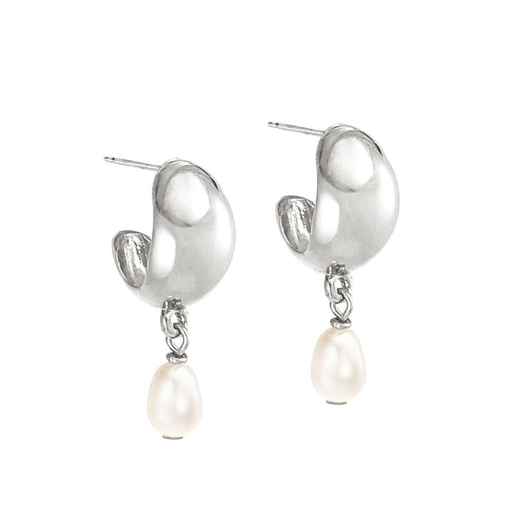 The Origin Pearl Huggies - Silver by Biko are a must-have, versatile accessory. These huggie hoop earrings feature comfortable curves that hug the earlobe and a perfect little pop of freshwater pearl. They are plated in rhodium over brass and have hypoallergenic surgical stainless steel posts.