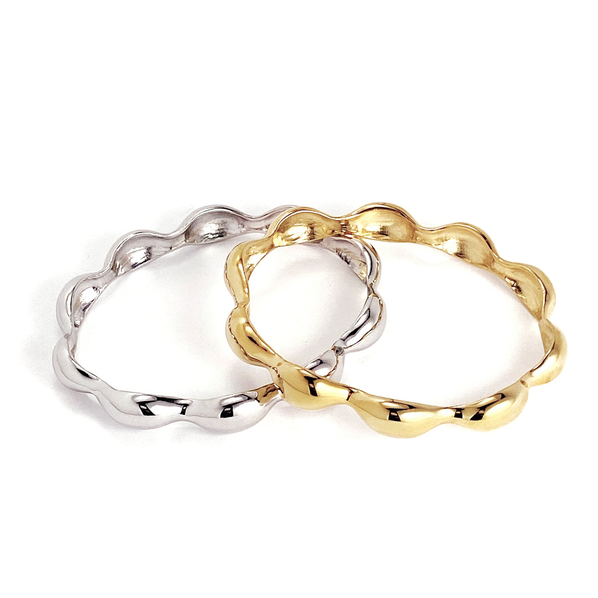 This bangle is plated with 14-karat gold over brass and has been manually hollowed out.