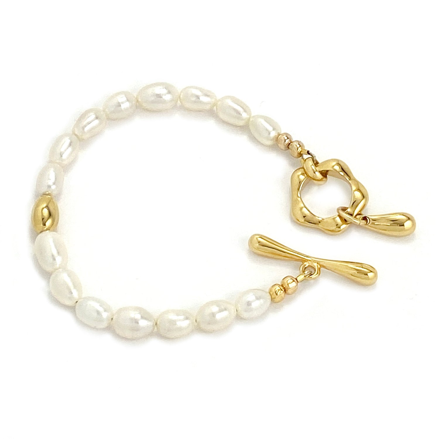 This bracelet is crafted with a 14k gold plating over brass. It features genuine freshwater pearls and hand-cast pearl beads.