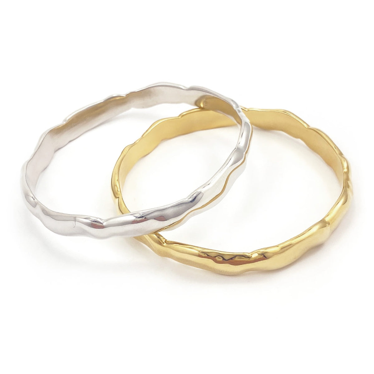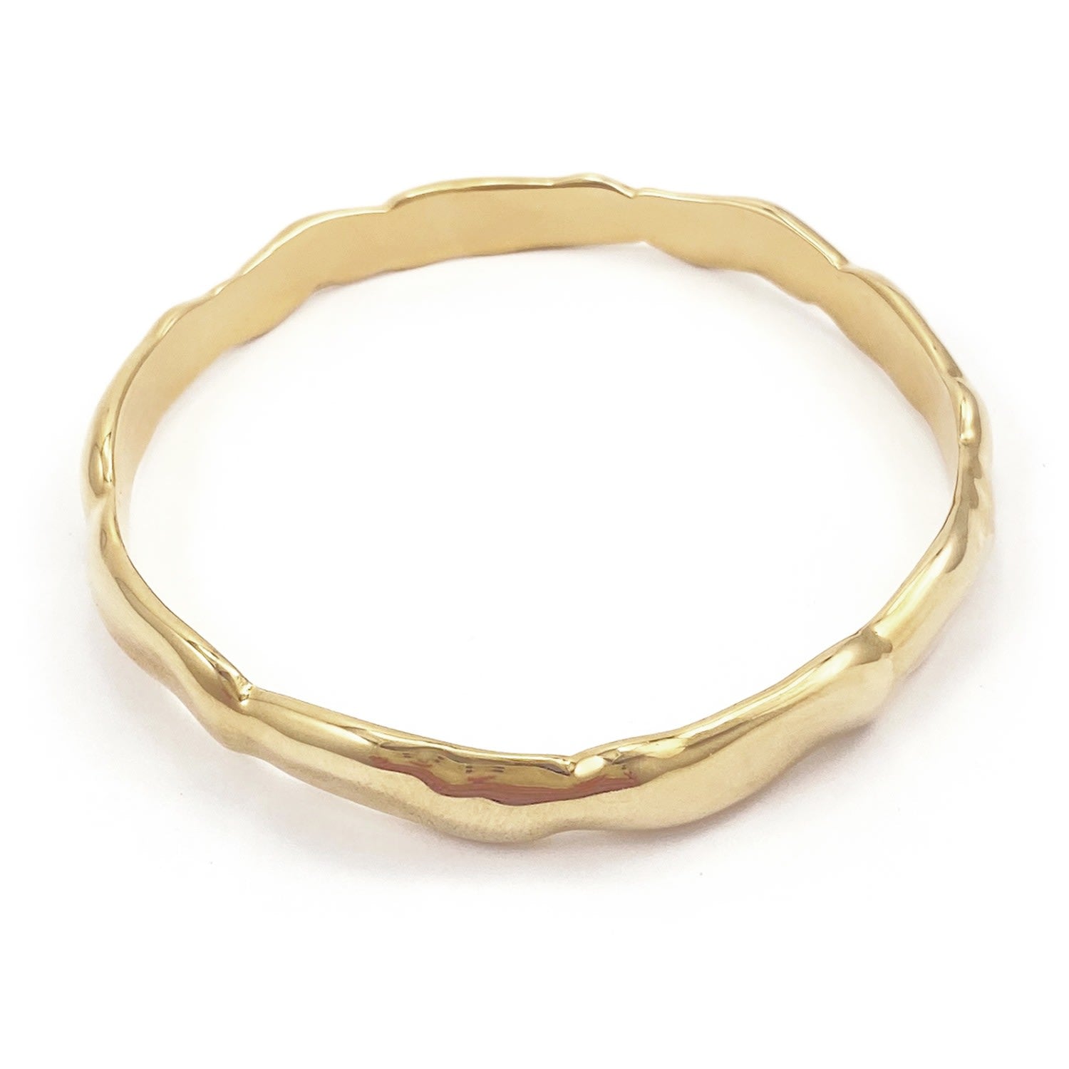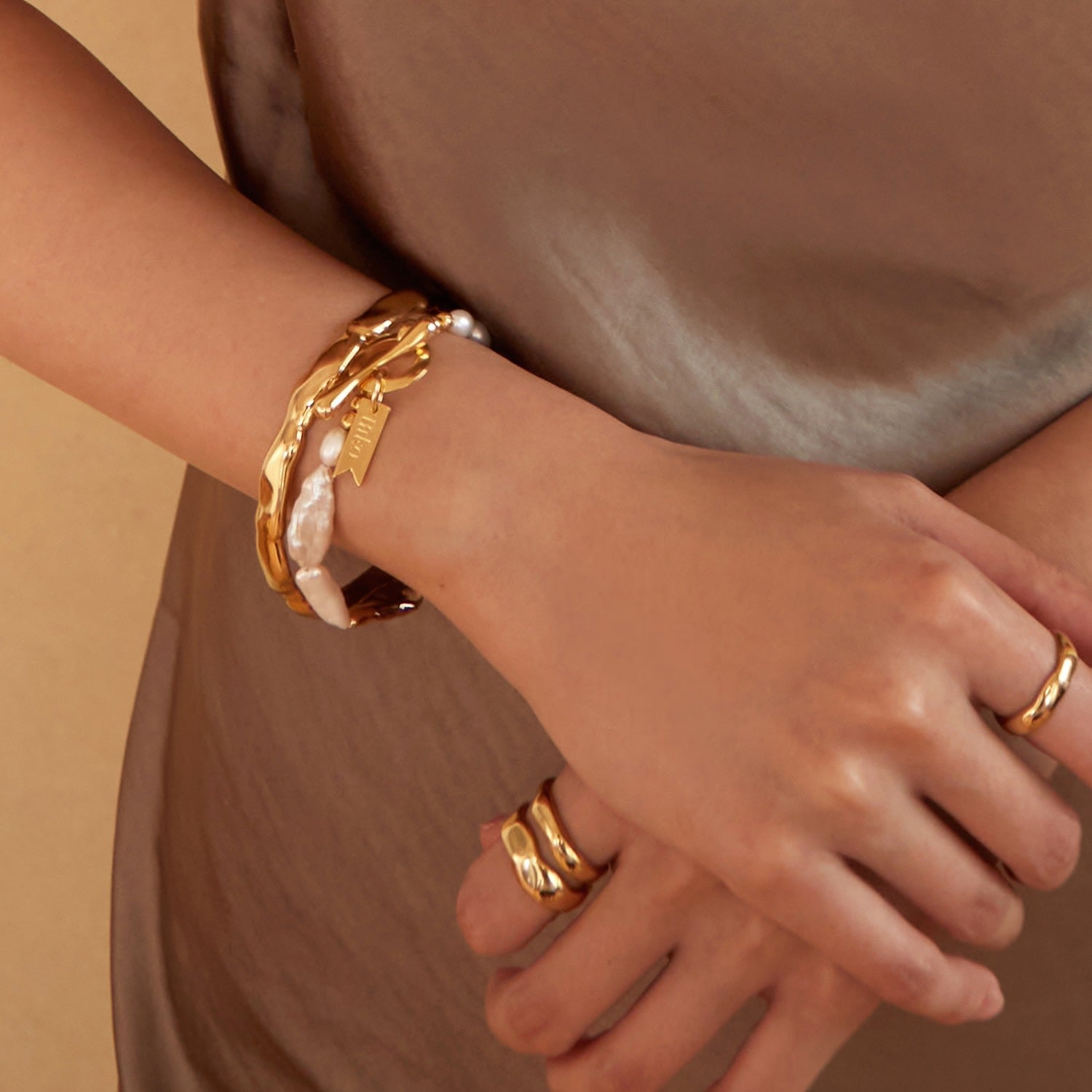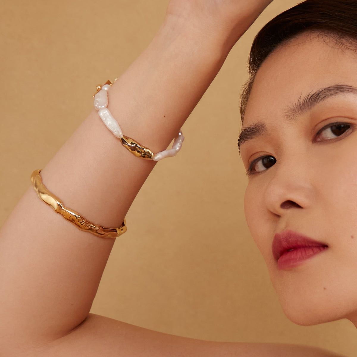 The Wavi Bangle Gold by Biko is a spectacular bangle with a unique texture. It was created by hand-casting a selection of natural, elongated pearls in metal to form a continuous loop. The curves and texture reflect light beautifully, making it an incredible and stylish piece.