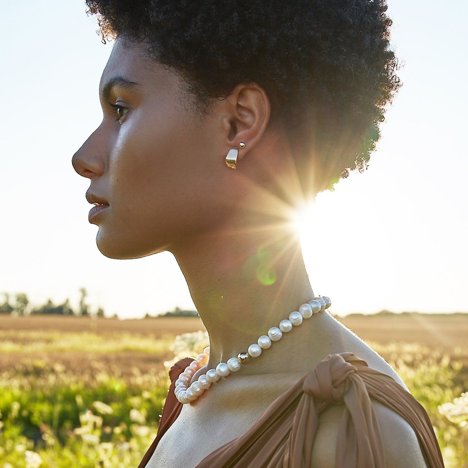 This Paloma Pearl Collar Gold by Biko is an elegant and symbolic necklace. The collar features natural freshwater pearls and a unique gold bead crafted from a hand-cast freshwater pearl, polished to perfection. This piece, named for the symbol of peace, can be worn at two different lengths, offering versatility and a luxurious, handcrafted aesthetic.