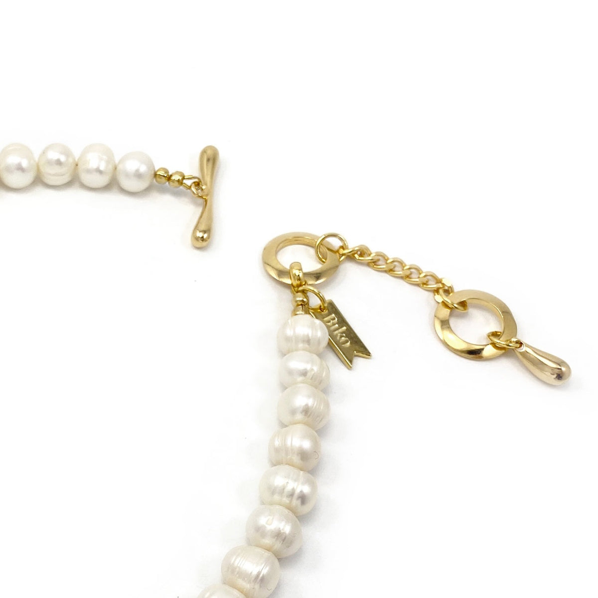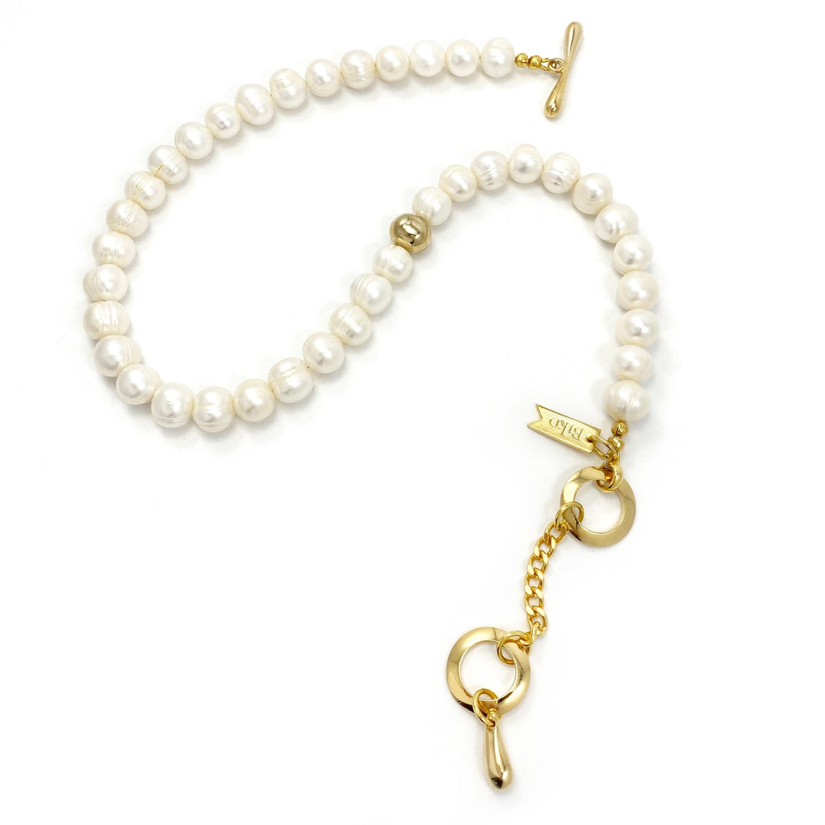 This collar necklace is made from 14k gold plating over a brass base. It features natural freshwater pearls and a hand-cast freshwater pearl bead. It is hypoallergenic.