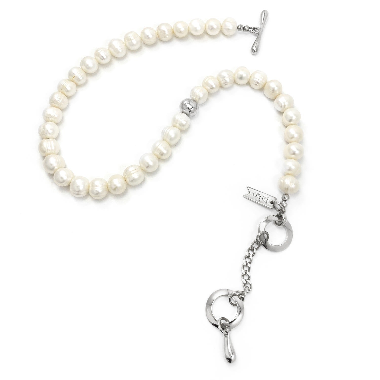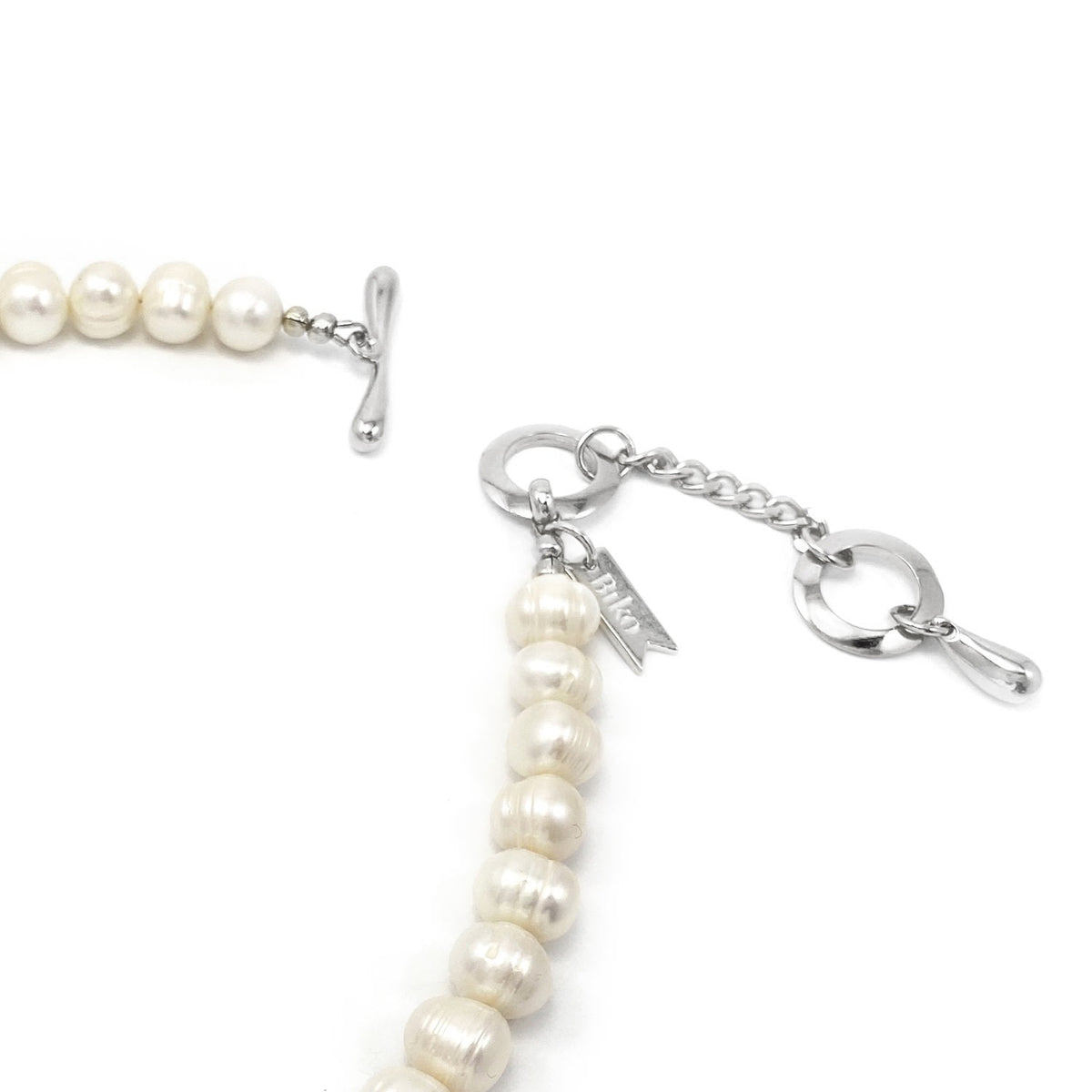This collar necklace is made from rhodium plating over a brass base. It features natural freshwater pearls and a hand-cast freshwater pearl bead. It is hypoallergenic. The product description states gold plating in the body, but the title and a mention of "rhodium plating" suggest it is silver-toned. Rhodium plating is the material in this case.