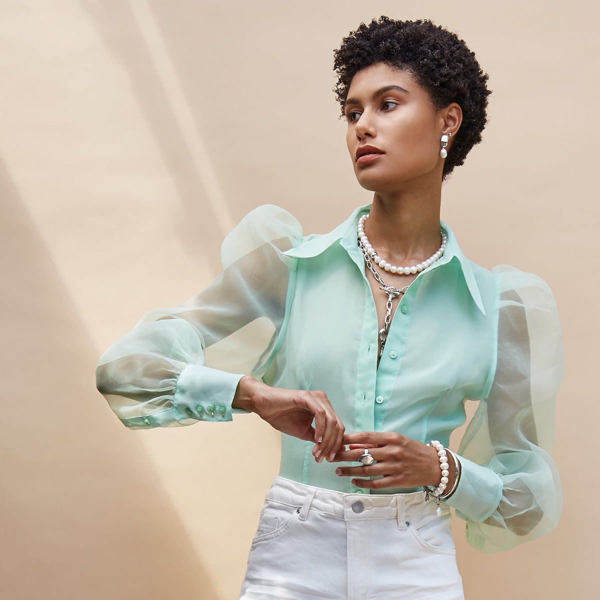 This Paloma Pearl Collar Silver by Biko is an elegant and symbolic necklace. The collar features natural freshwater pearls and a unique gold bead crafted from a hand-cast freshwater pearl, polished to perfection. This piece, named for the symbol of peace, can be worn at two different lengths, offering versatility and a luxurious, handcrafted aesthetic.