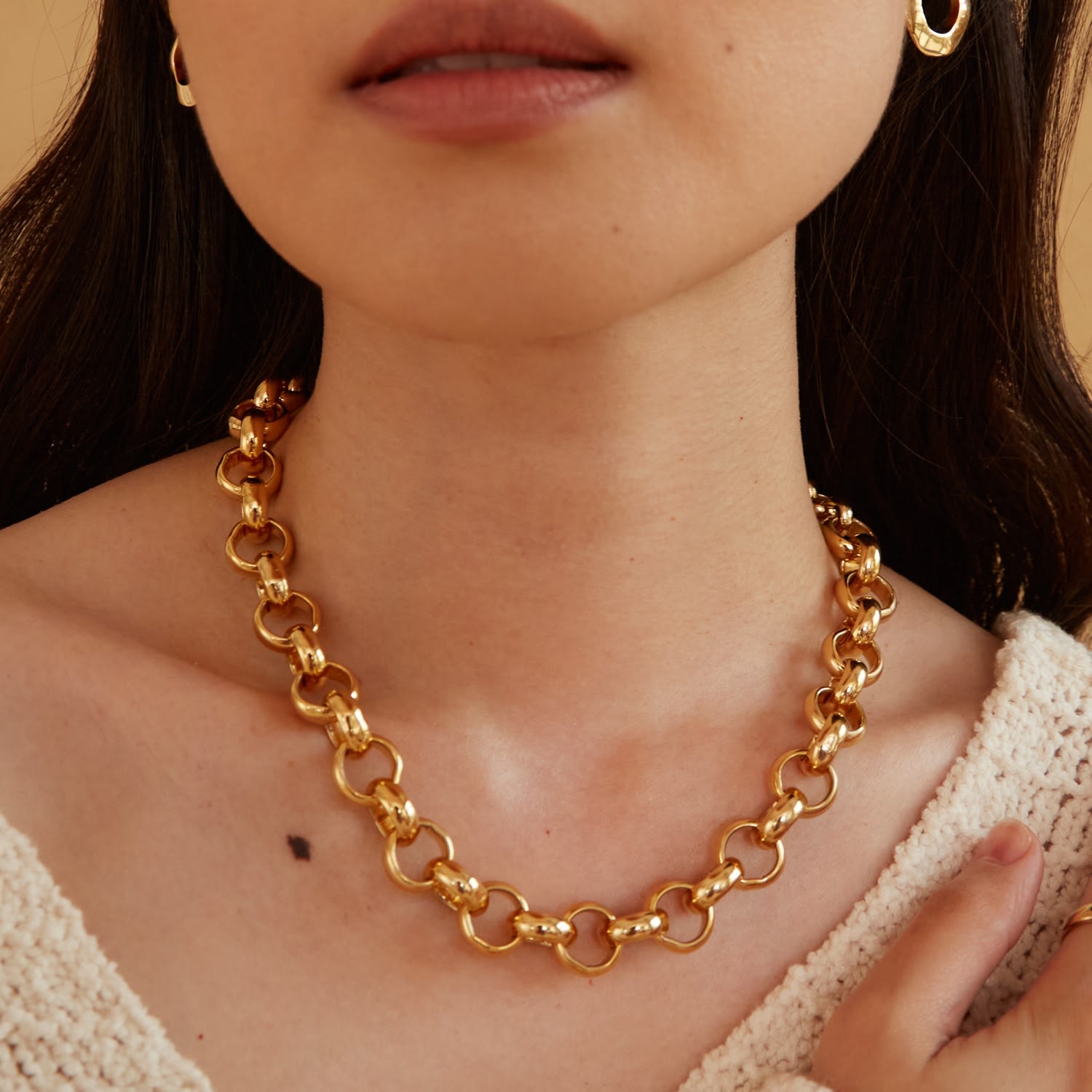 The Axel Convertible Collar Gold by Biko is an oversized and versatile chain necklace. The dimensional chain is designed to be worn in multiple ways, with the toggle loops to the front as a cool-girl pendant or to the back for a chic chain statement. The toggle loops are created from a casting of a baroque pearl. The necklace is plated in 14-karat gold over brass.