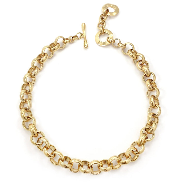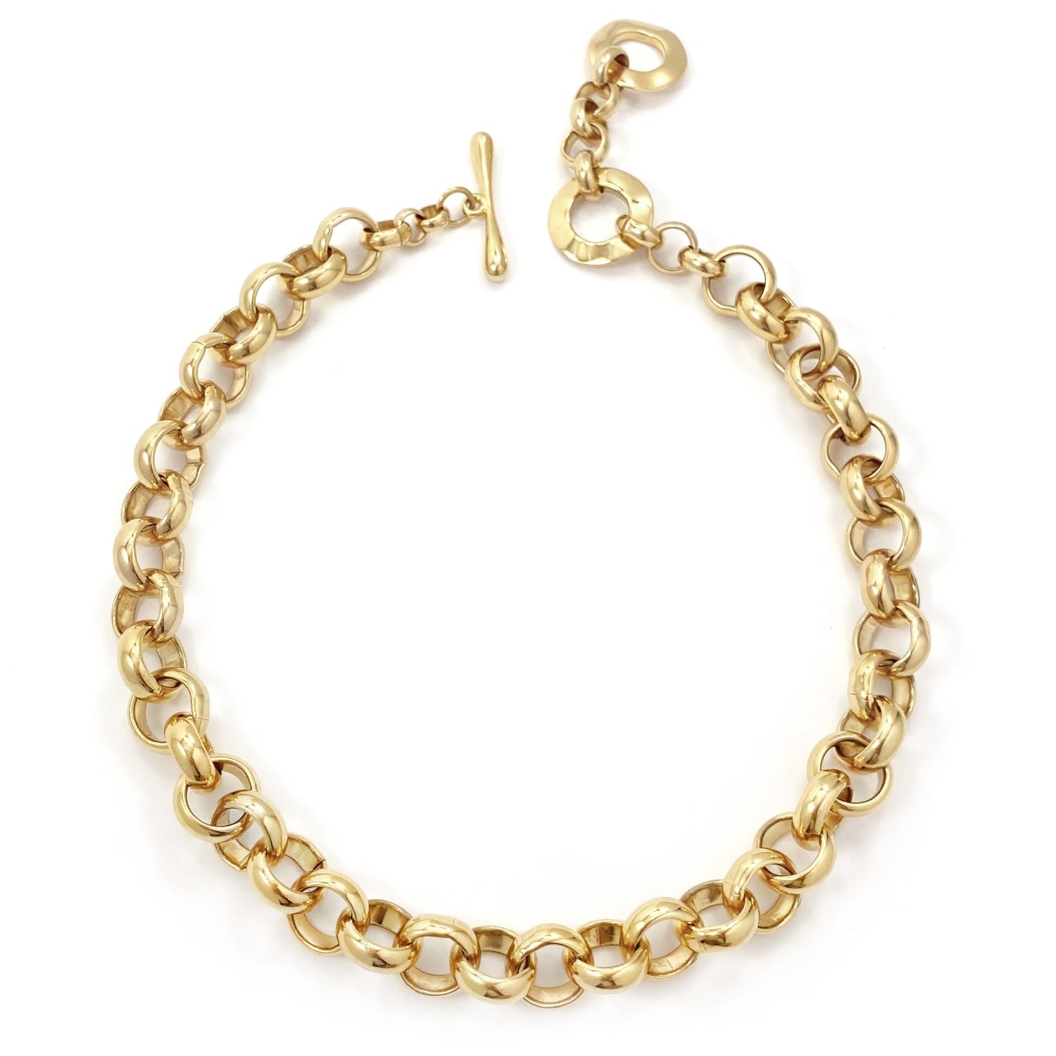 This chain necklace is made from brass with 14-karat gold plating. The toggle loops are a casting of a baroque pearl.