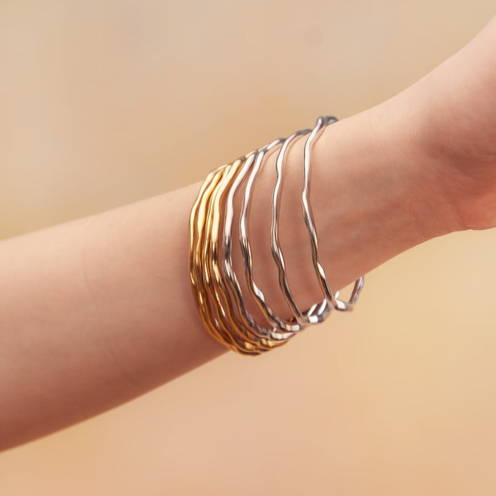 The Rio Bangle - Gold by Biko is a piece that captures the vibrant and unstoppable energy of Rio. Its organic, molten wave design, handcrafted from a custom-cast baroque pearl, makes it a perfect piece to stack for a bold look or wear solo for a subtle touch of elegance. This bangle is a great way to add a spirited and artistic flair to your style.