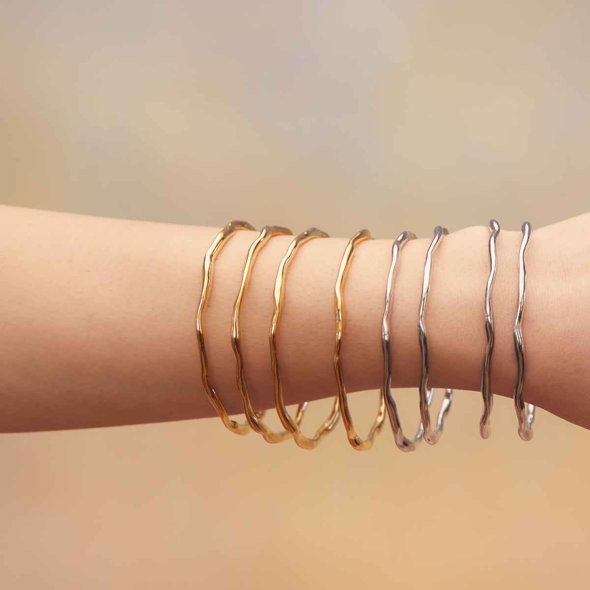 This bangle is 14k gold-plated over brass and features a handcrafted, organic molten wave inspired by a custom-cast baroque pearl.
