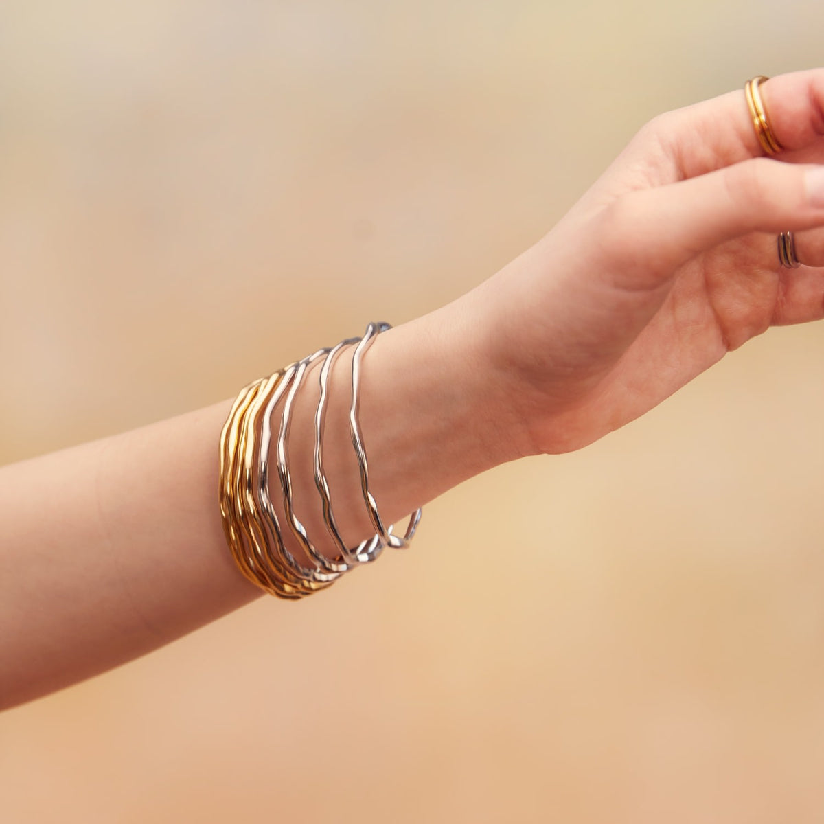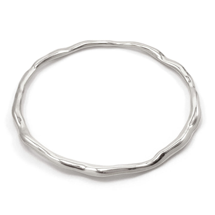 The Rio Bangle - Silver by Biko captures the vibrant and spirited energy of Rio. Its organic, molten wave design is handcrafted from a custom-cast baroque pearl, making it a unique and artistic piece. This bangle, plated in rhodium over brass, is a perfect accessory to stack with others or enjoy solo for a touch of elegance.