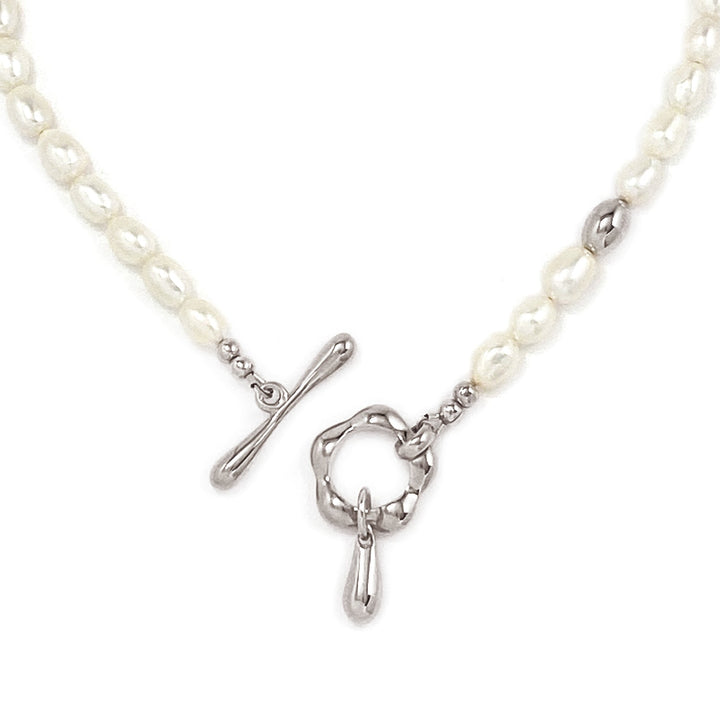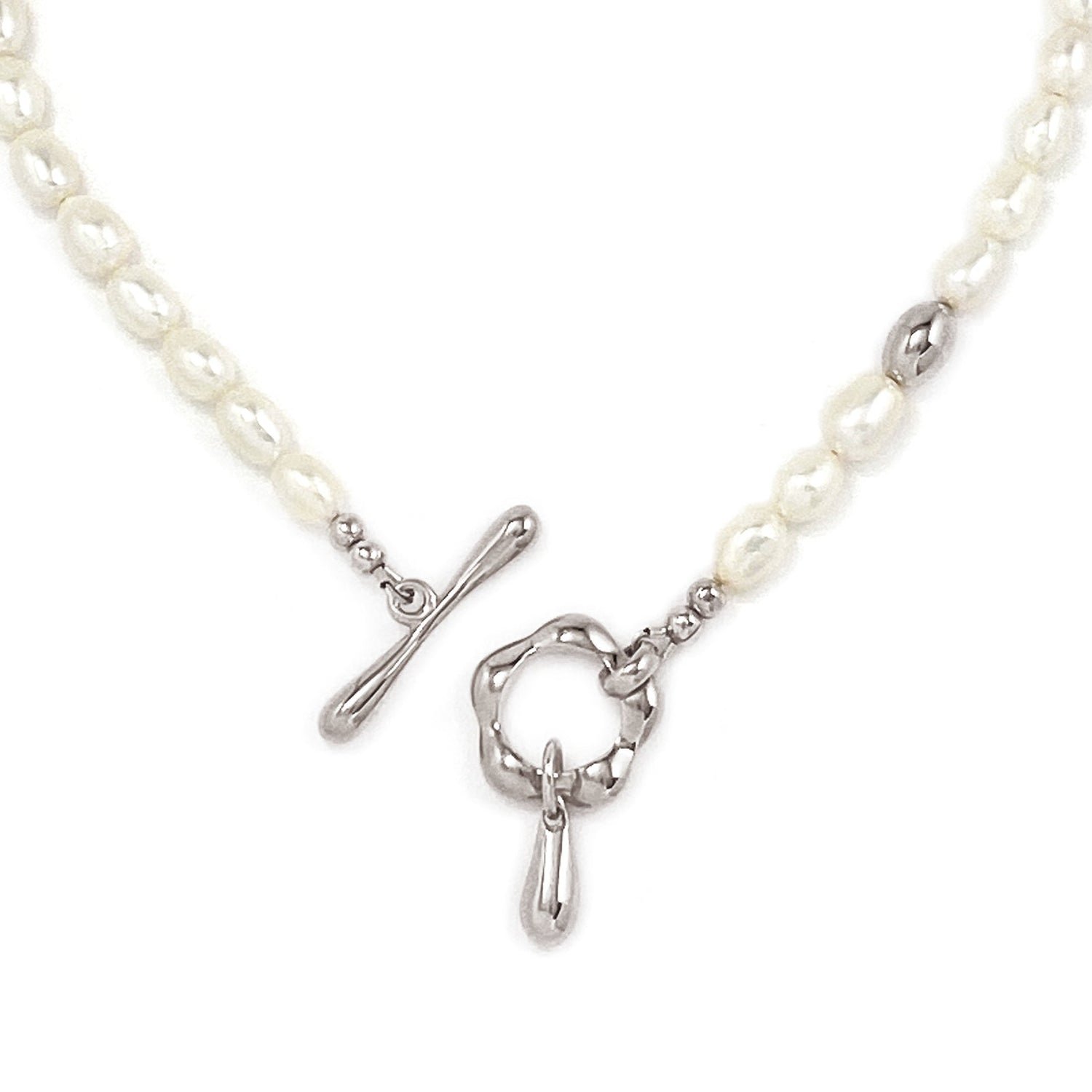 Plated in rhodium over brass with genuine freshwater pearls and hand-cast oval beads. Made in Canada.
