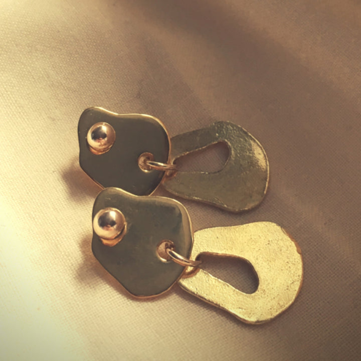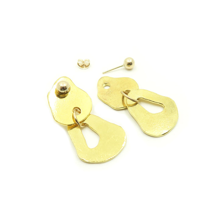 These Tesla Gold Earrings by Bio-Trimmings are abstract and versatile. They feature pebble-like shapes in 18K gold vermeil eco-silver. They can be worn on their own as ball studs or with the metal pendants to create a different look.