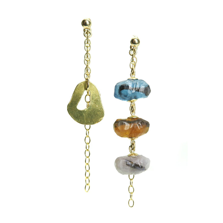 These mismatched stud earrings are handmade from recycled sterling silver plated with 18ct gold. They feature a trio of Bio-Gems formed from plant fibers.