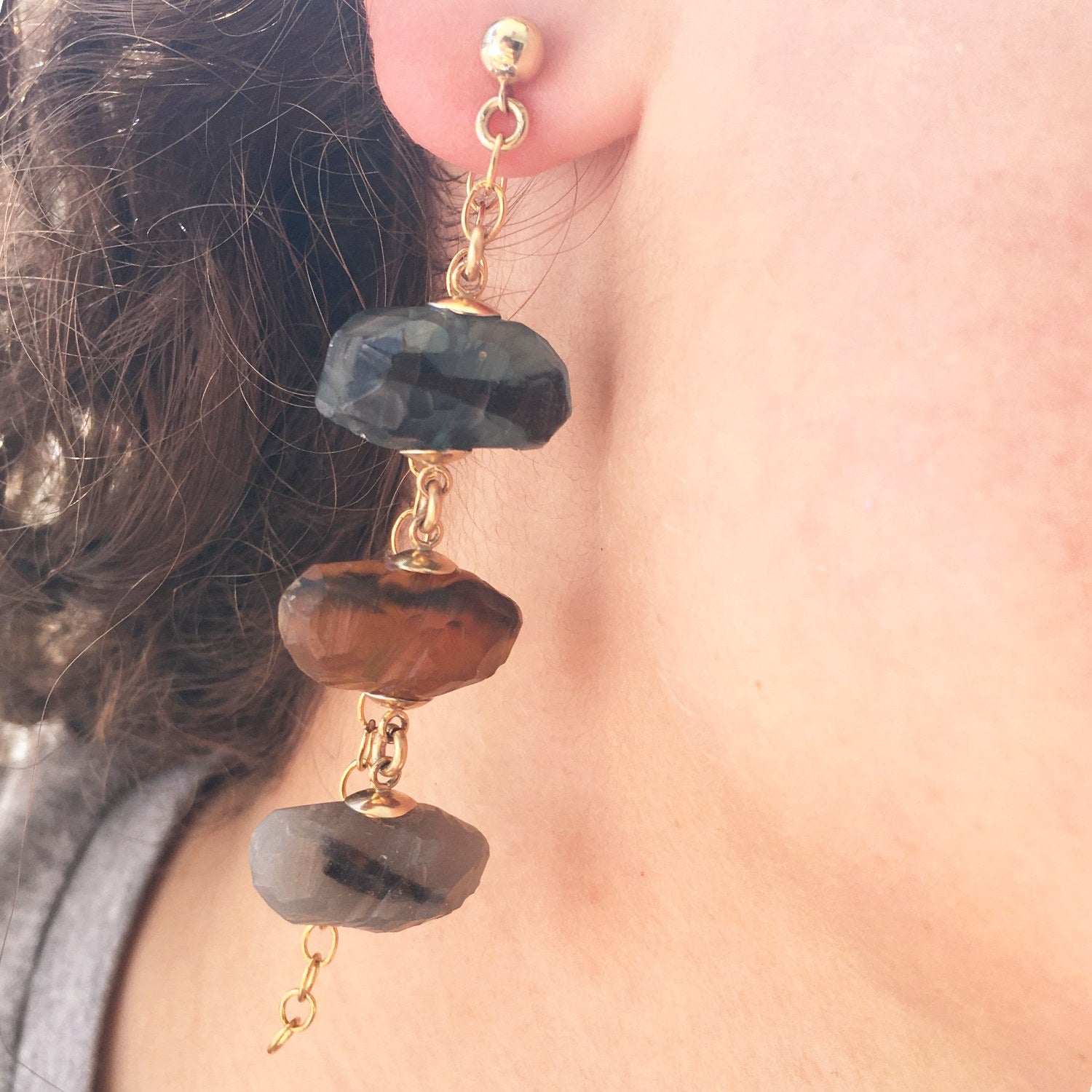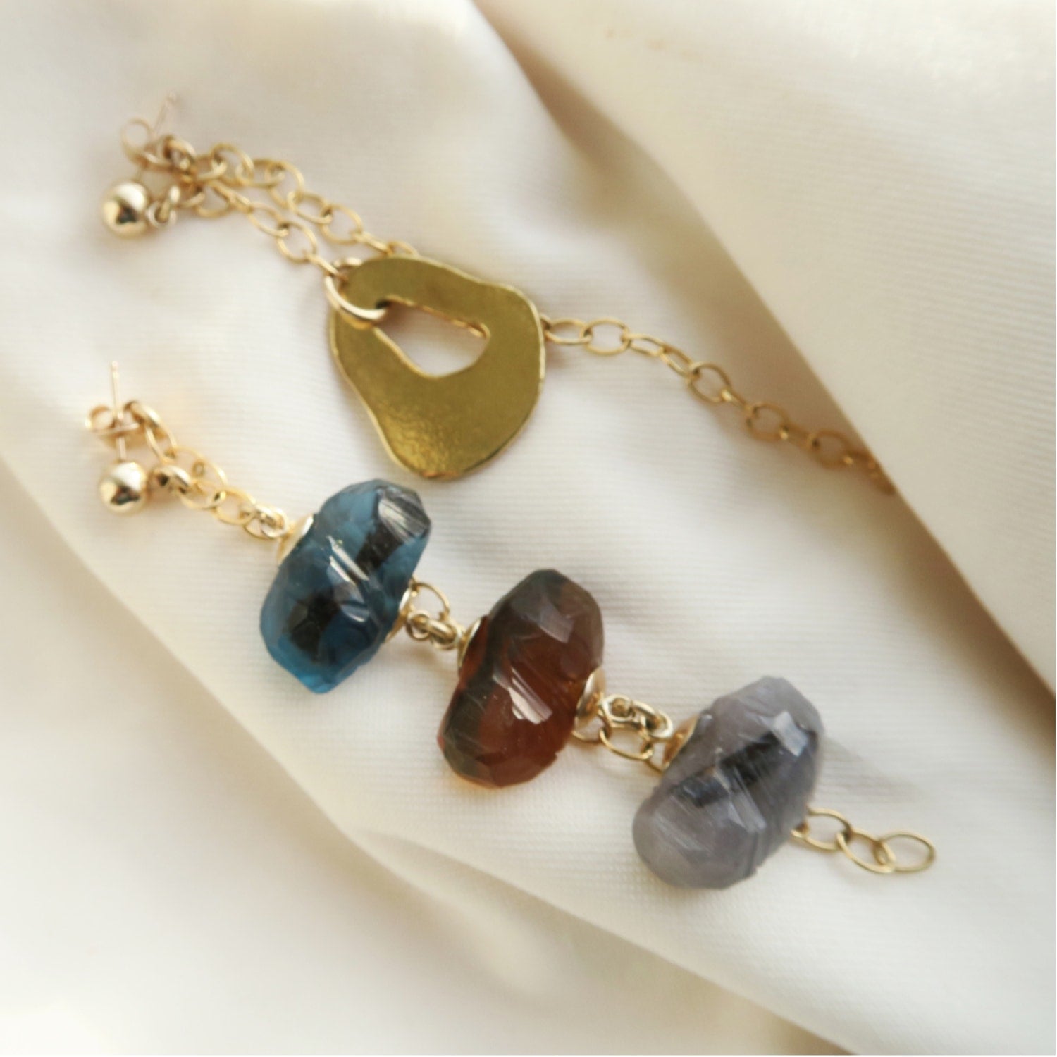 These Seaborg Earrings - Gold by Bio-Trimmings are a beautiful and eco-friendly accessory. These mismatched chain stud earrings are handmade from recycled silver and plated with 18ct gold. They feature beautiful Bio-Gems embedded with plant fibers, making them a unique and playful accessory.