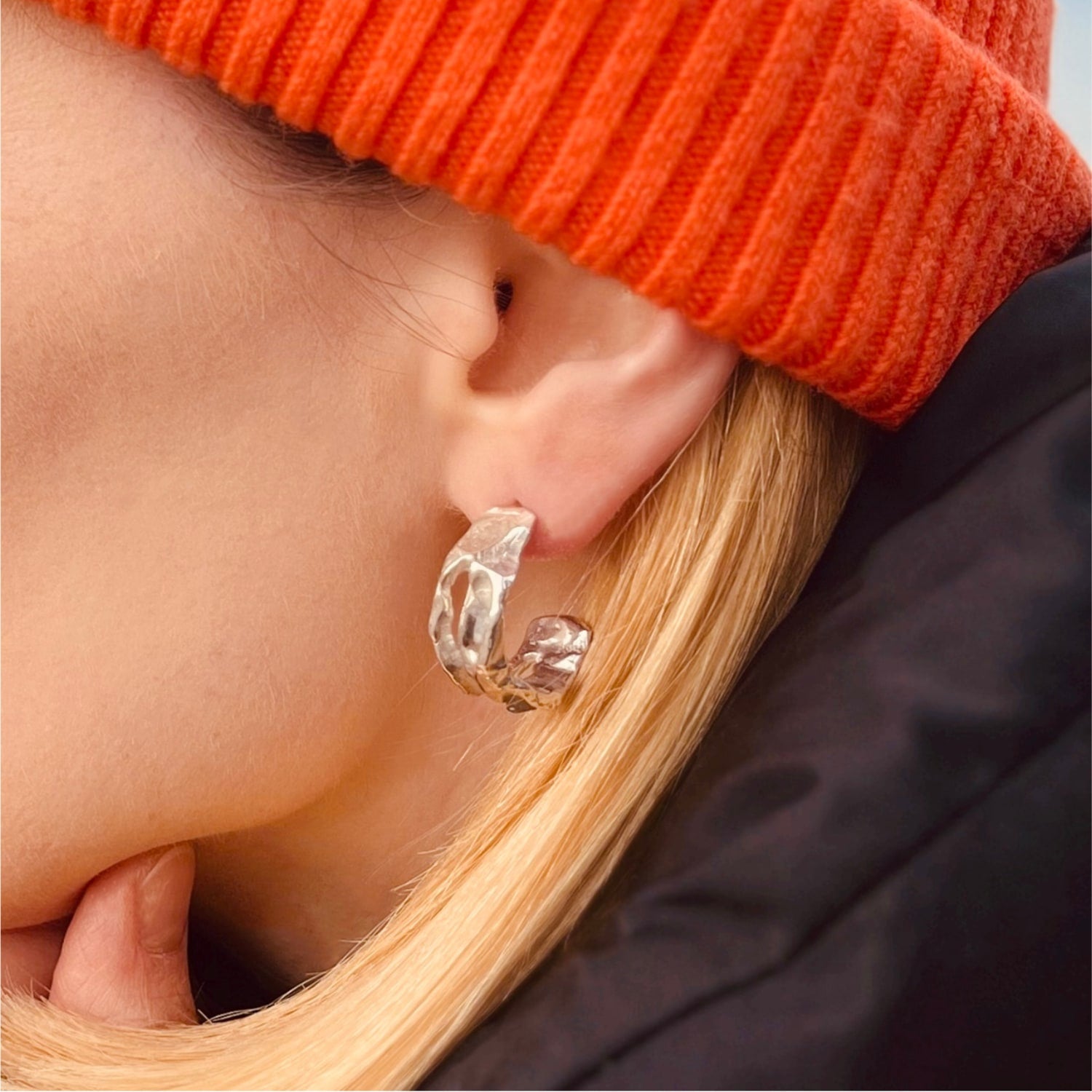 These Barba C-Hoop Earrings – Blue by Bio-Trimmings are a unique pair of alternative c-hoop earrings. They are handmade from recycled sterling silver into an organic, freeform shape inspired by the natural forms of the coast. The beautiful Bio-Gems embedded with plant fibers in soft blue tones make these earrings perfect for elevating any outfit.