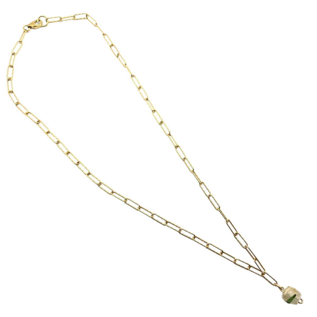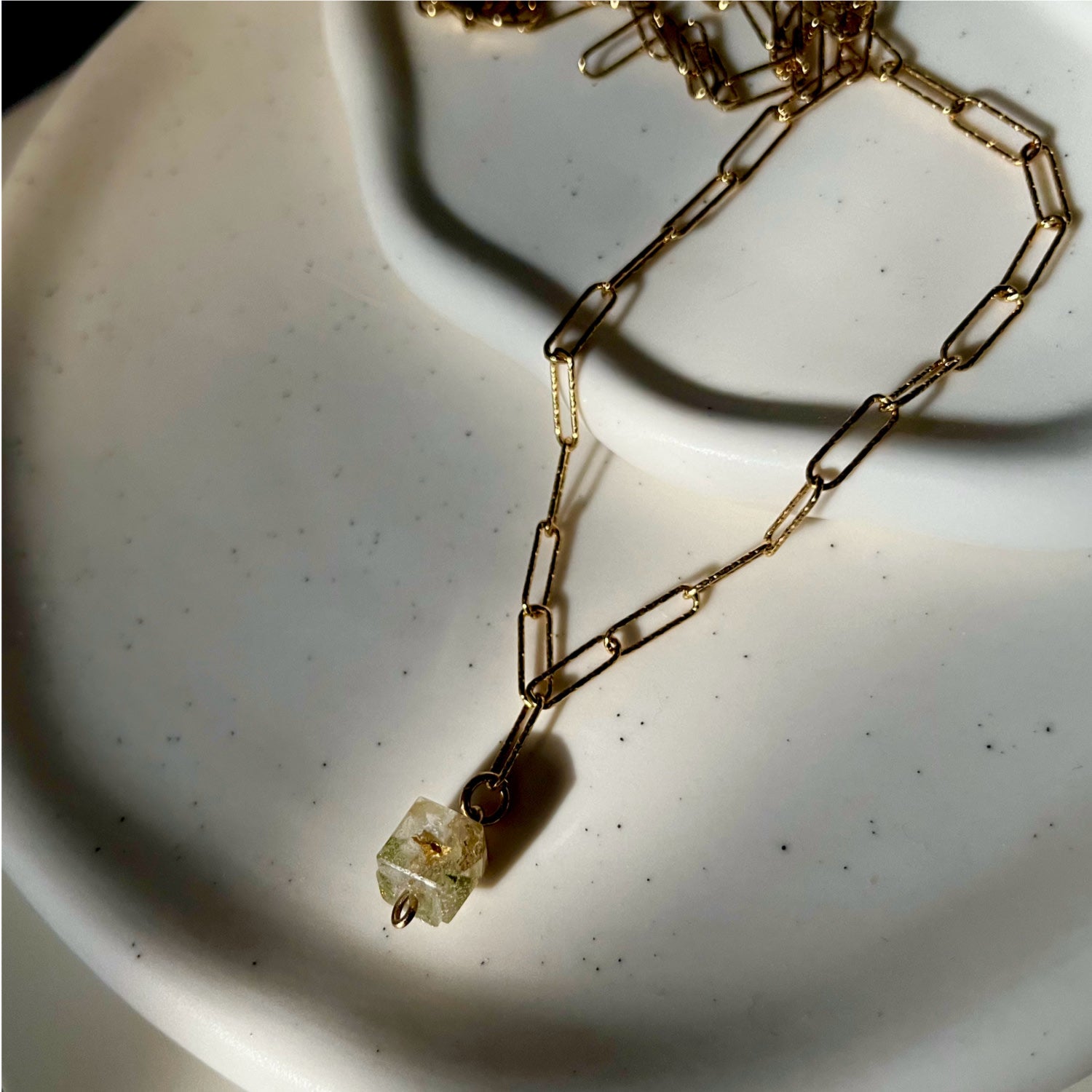 Handmade in London with Bio-Gem formed from plant fibres, embedded with gold leaf, and set in recycled sterling silver plated in thick 18k gold vermeil. Adjustable 20″ paperclip-style chain.