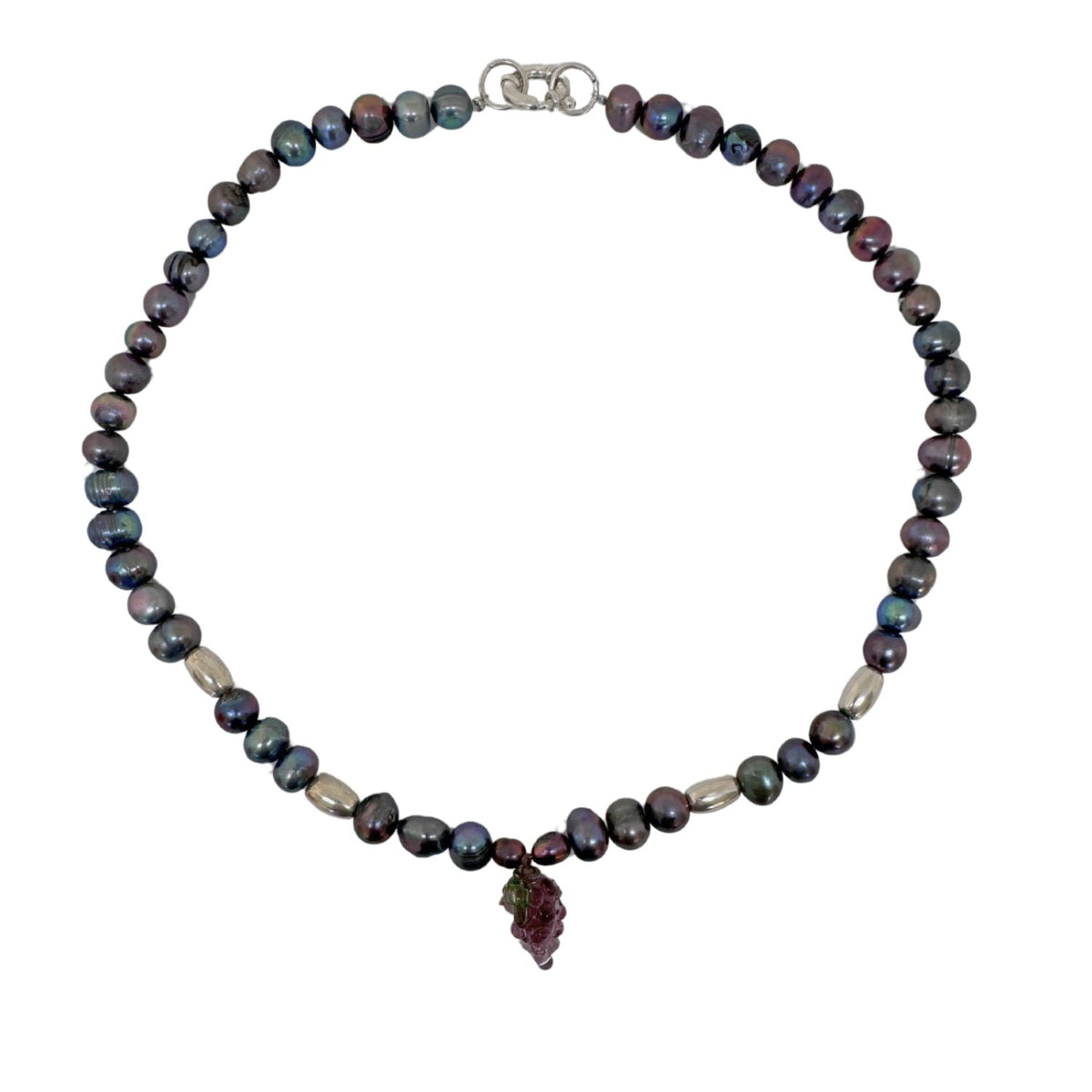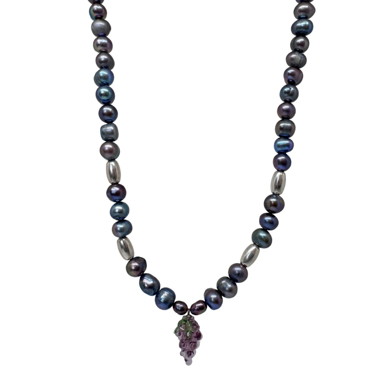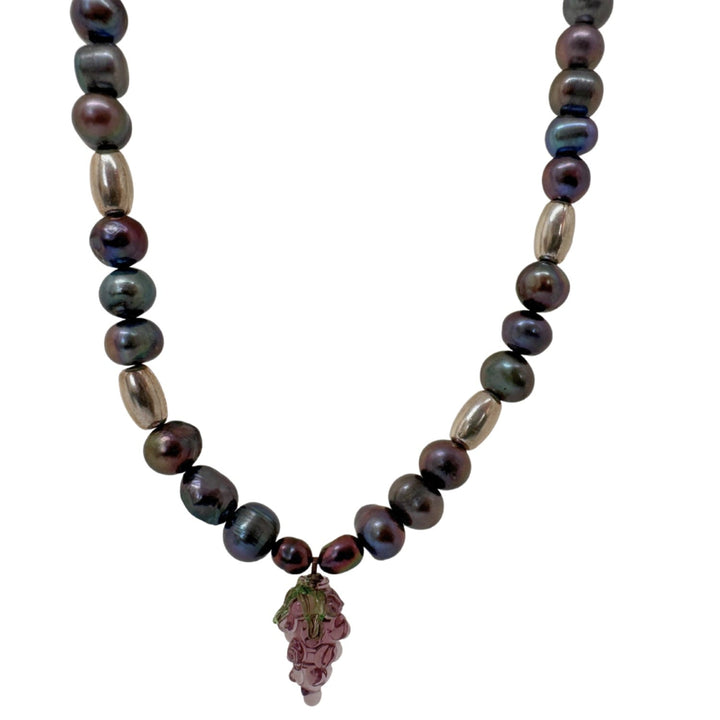 This necklace features a black pearl, a glass grape pendant, and a sterling silver fastening.