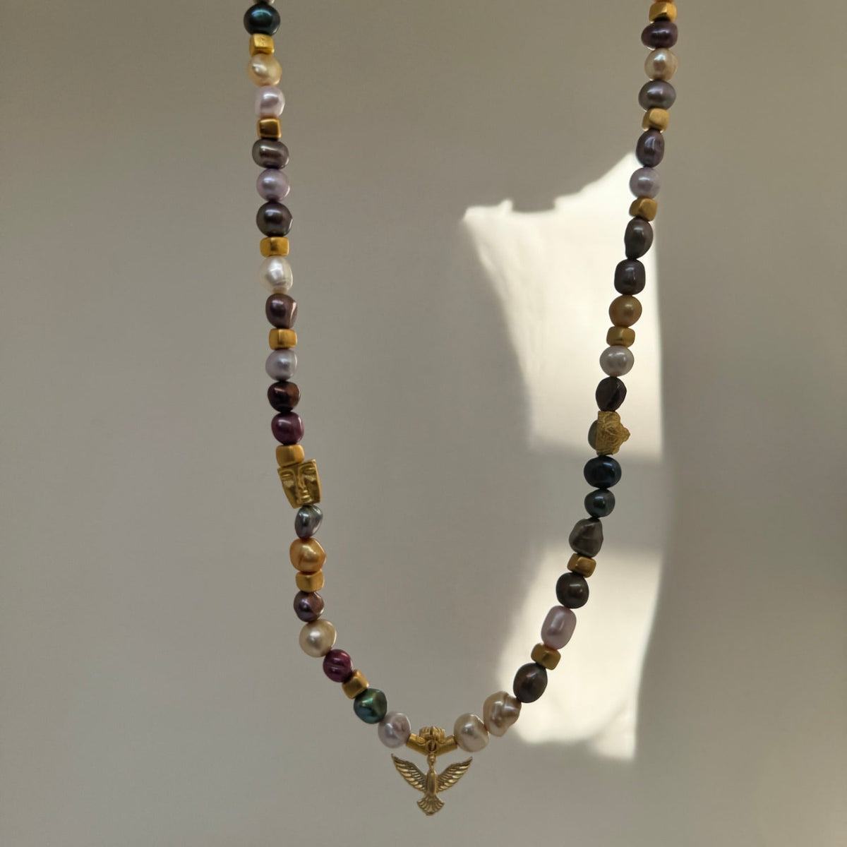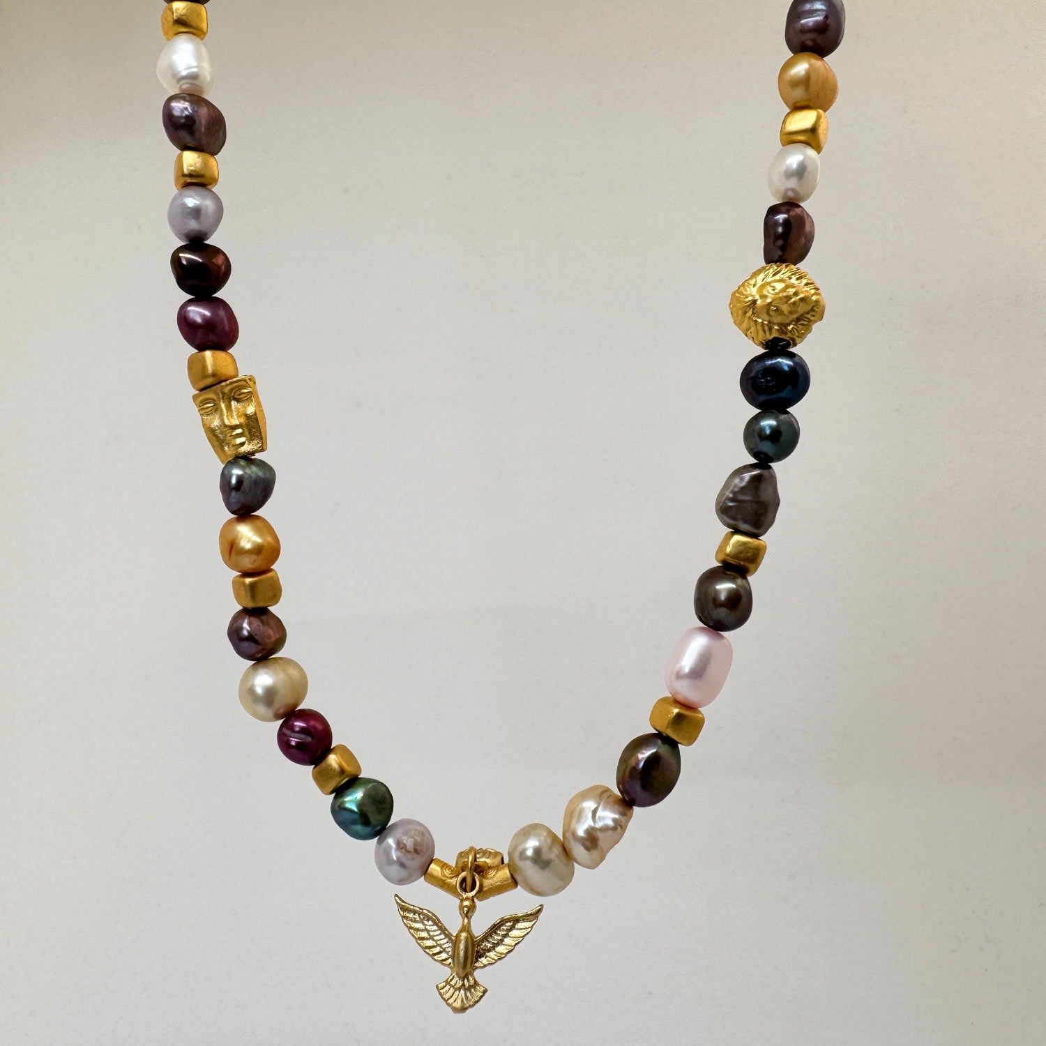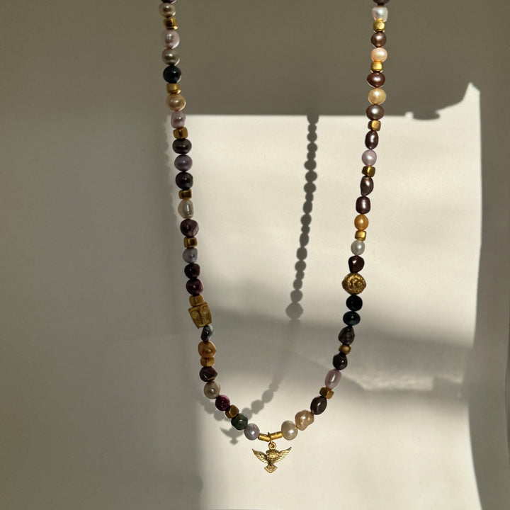 This Dusk Glow Pearl Charm Necklace by Black and Wild is a handcrafted masterpiece that blends elegance with artistry. The necklace features a unique arrangement of multicolored pearls and golden beads, accentuated by intricate charms like a radiant bird symbolizing freedom and a mystical golden face charm. This rich combination of textures and colors makes it a standout accessory for special occasions or a bold statement for everyday wear.