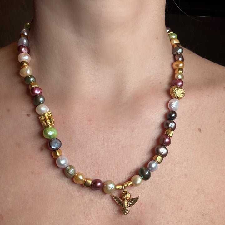 This necklace features a harmonious blend of multicolored pearls, golden beads, and golden charms.