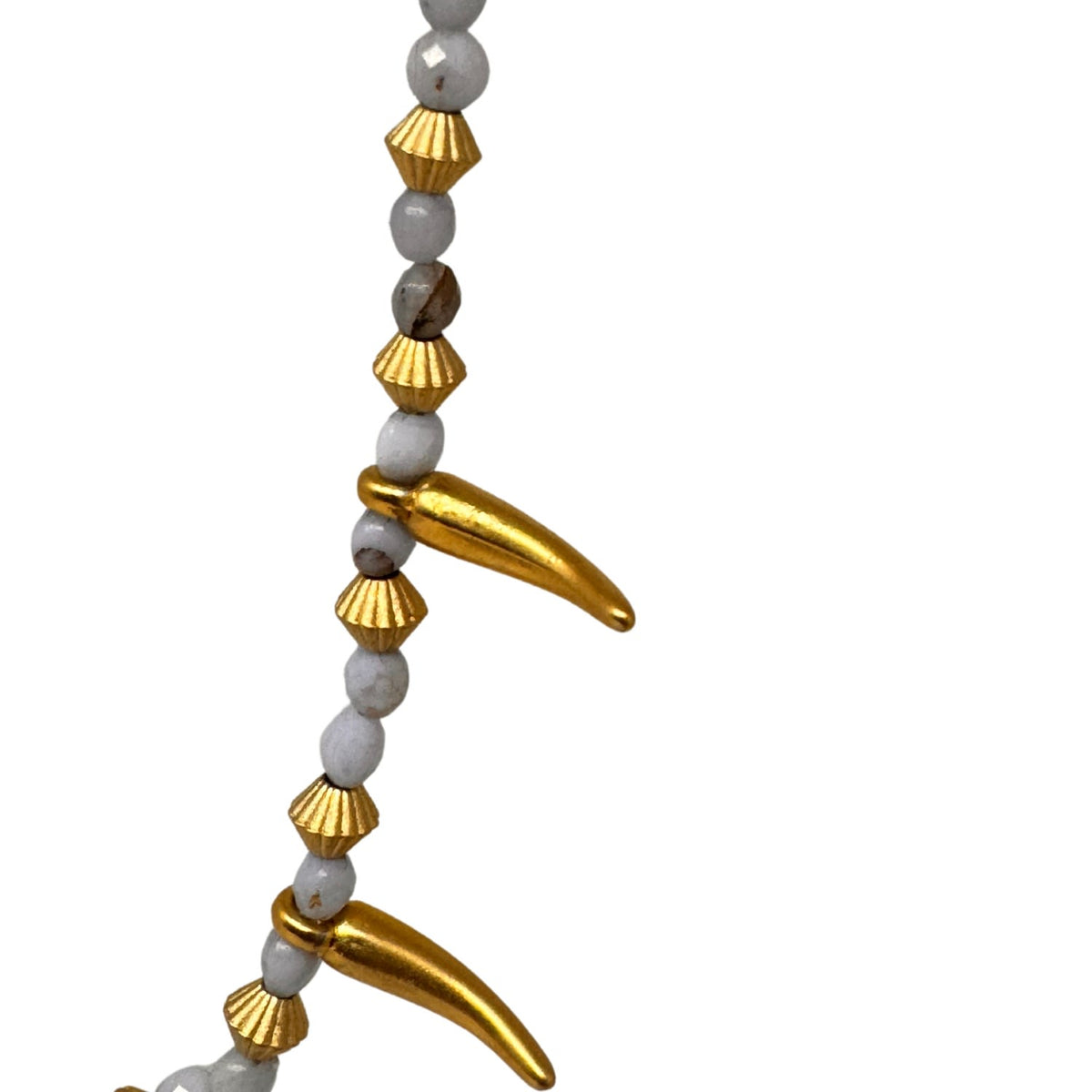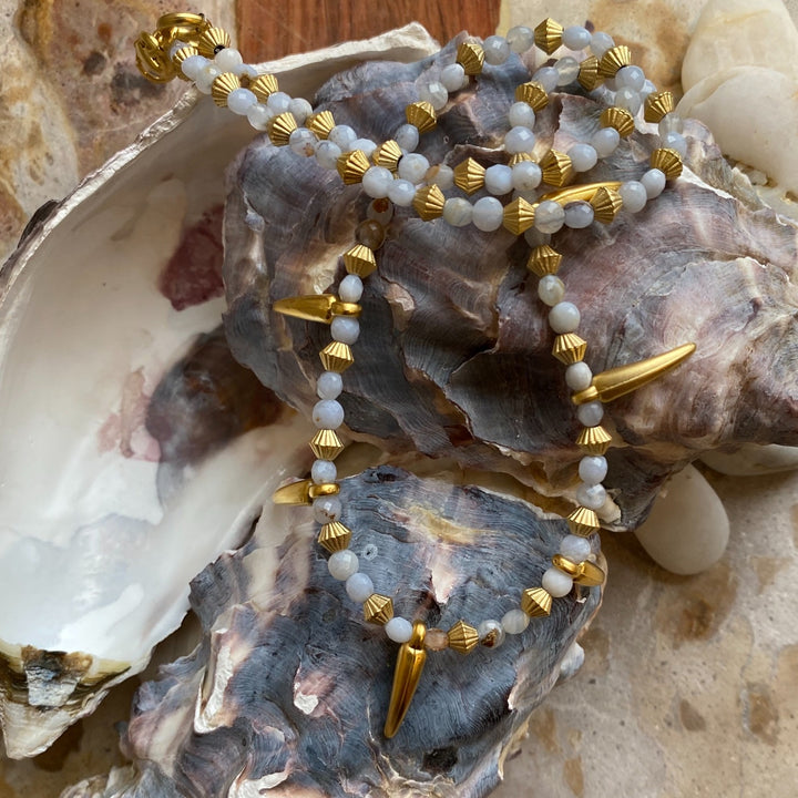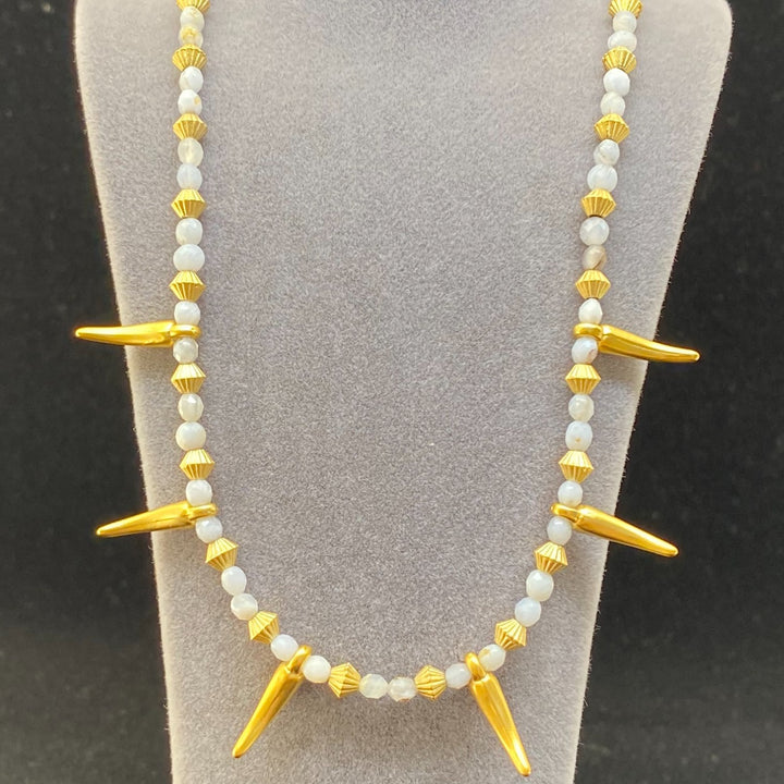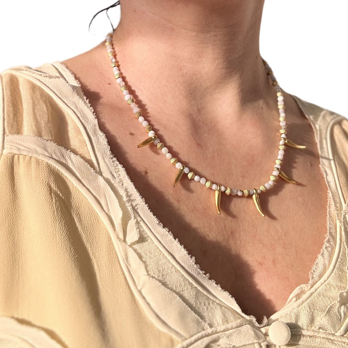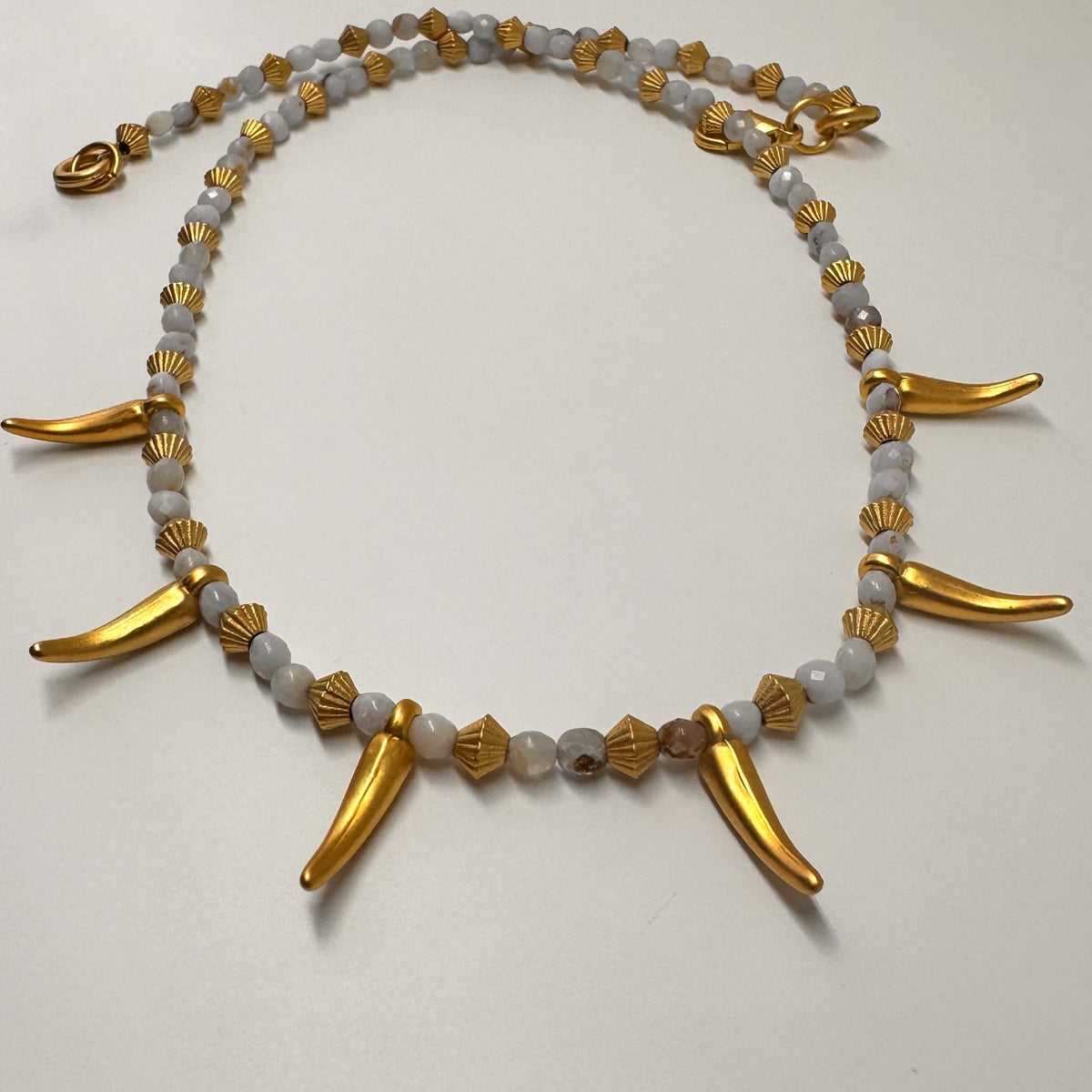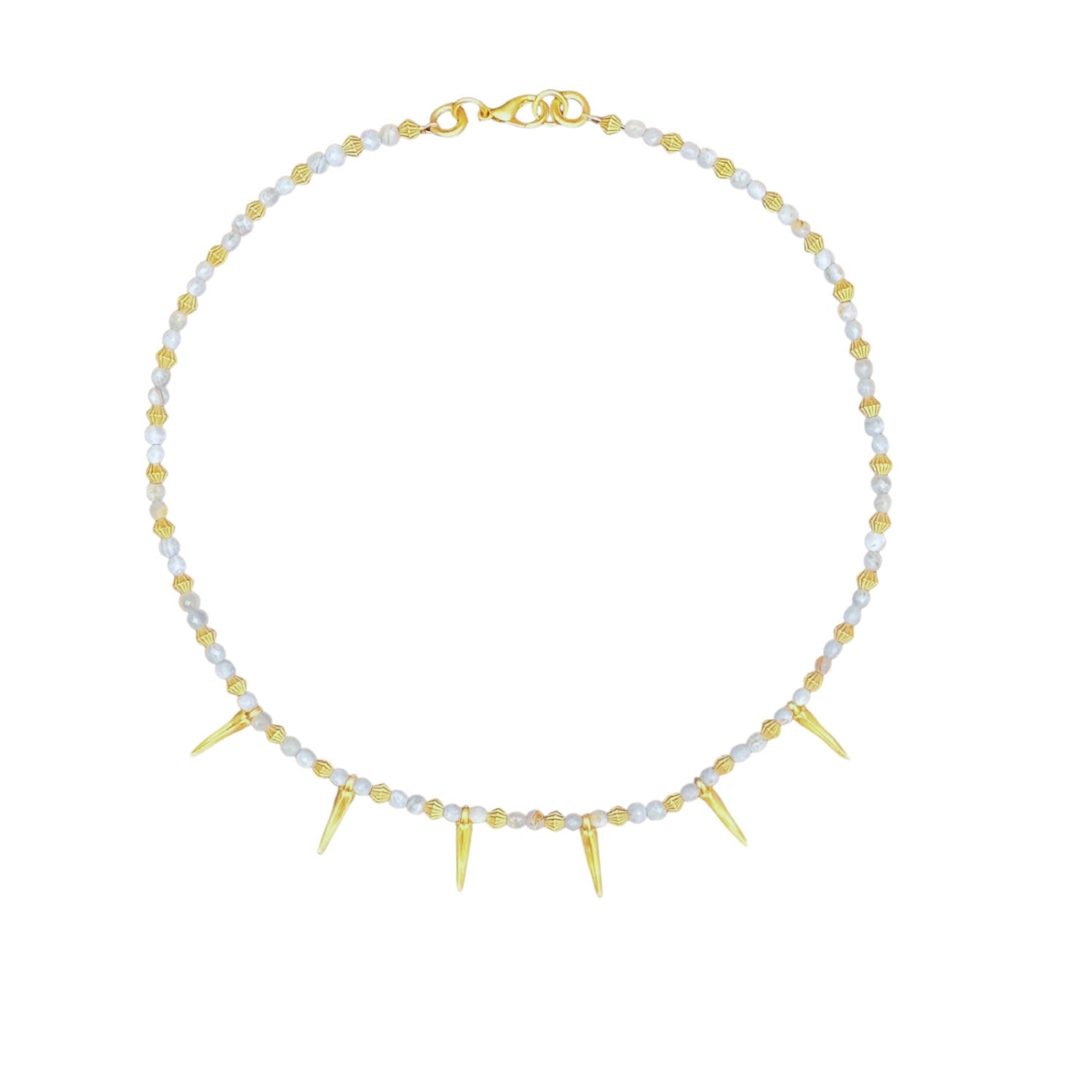 This beaded necklace is made from an aquamarine gemstone and a gold-plated chili pepper charm.