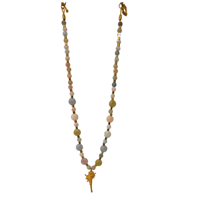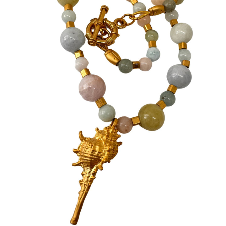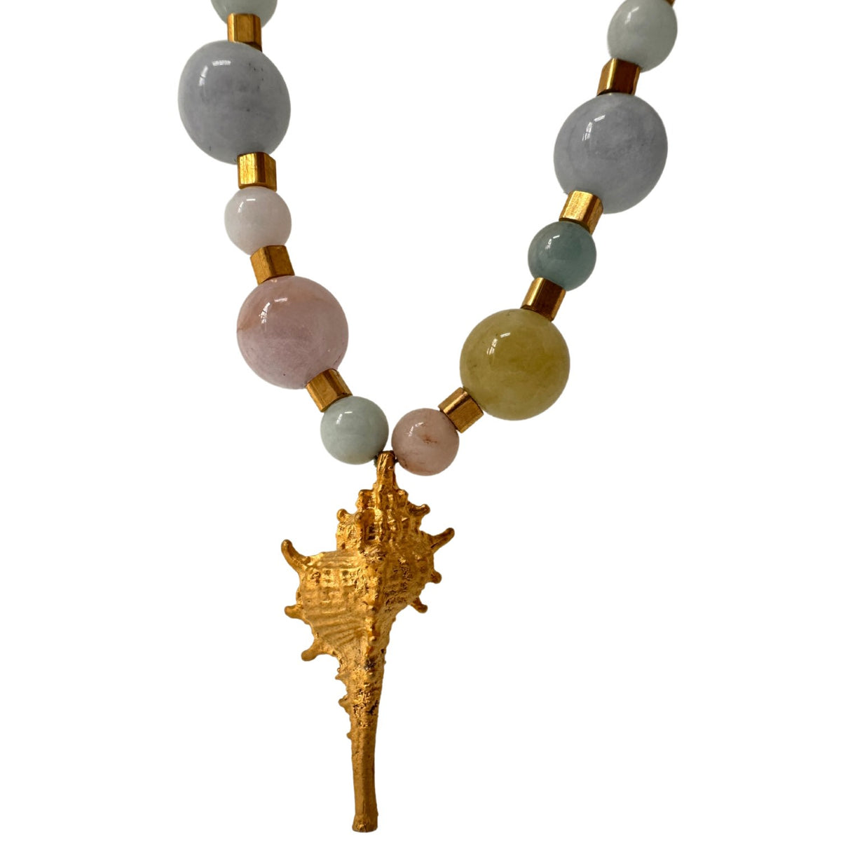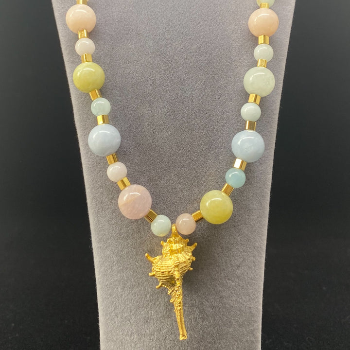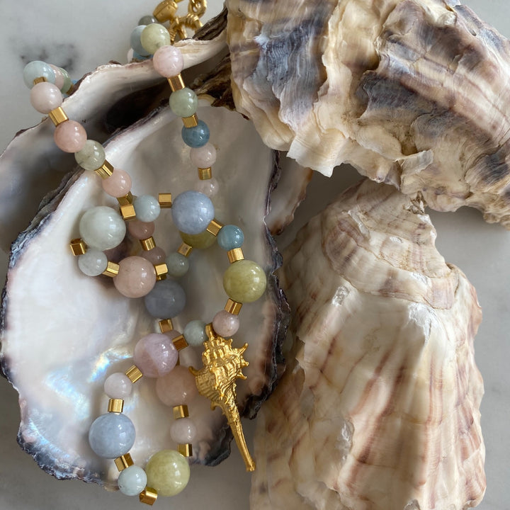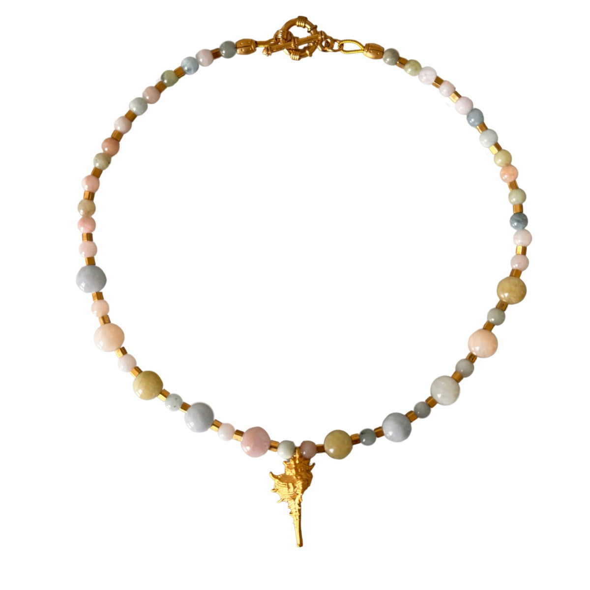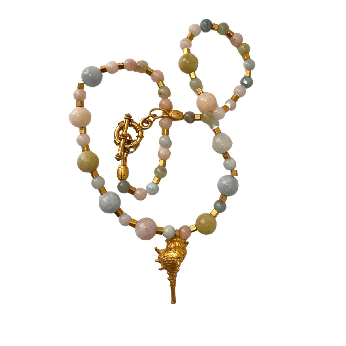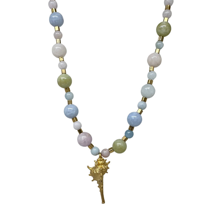 This beaded necklace is made from aquamarine heliodor gemstones and features a golden-plated seashell pendant.