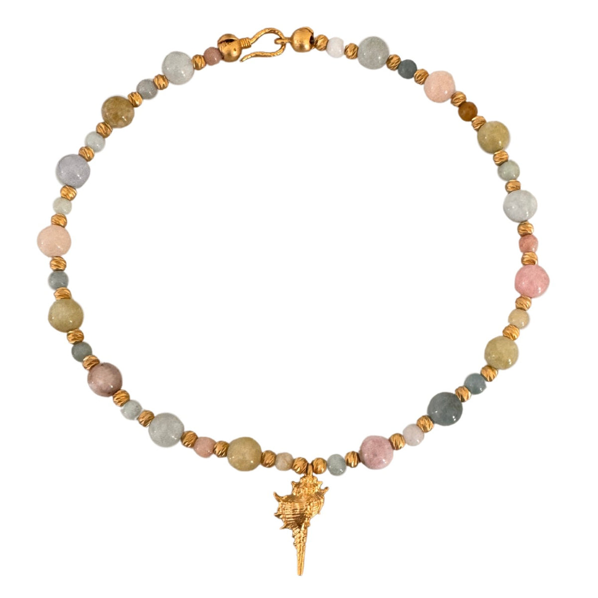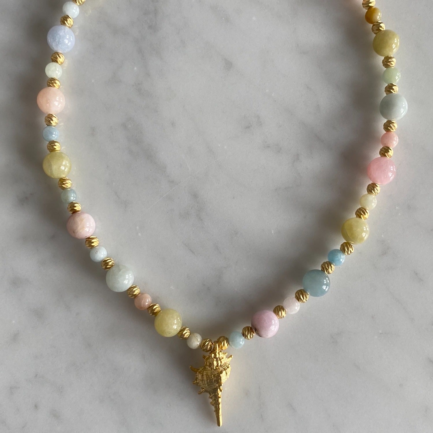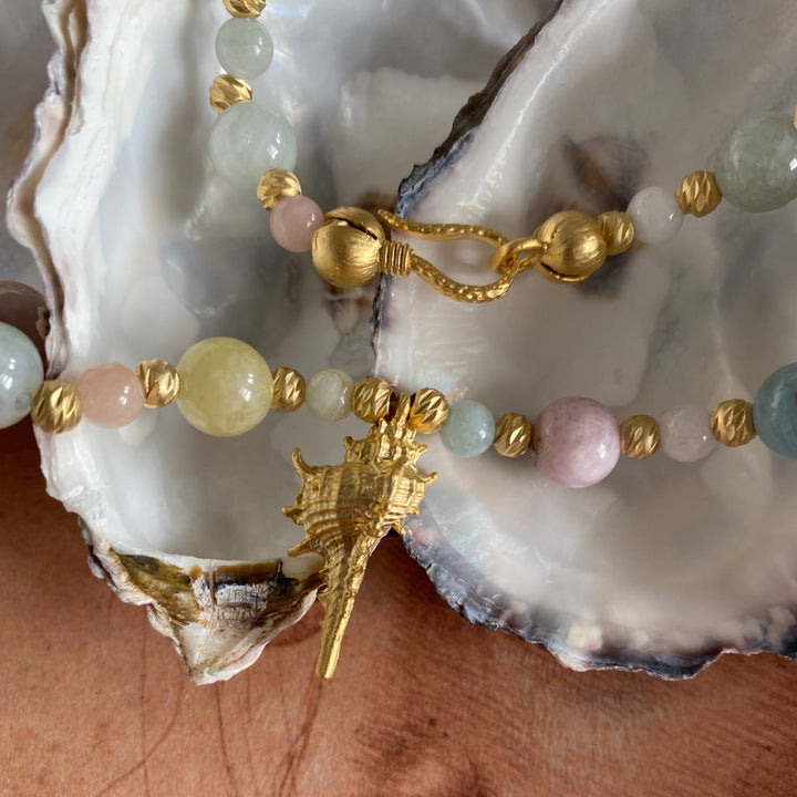 This beaded necklace is made from aquamarine heliodor gemstones and features a golden-plated seashell pendant.