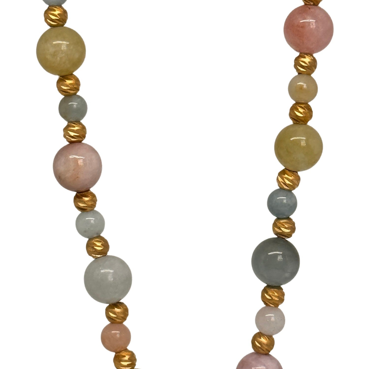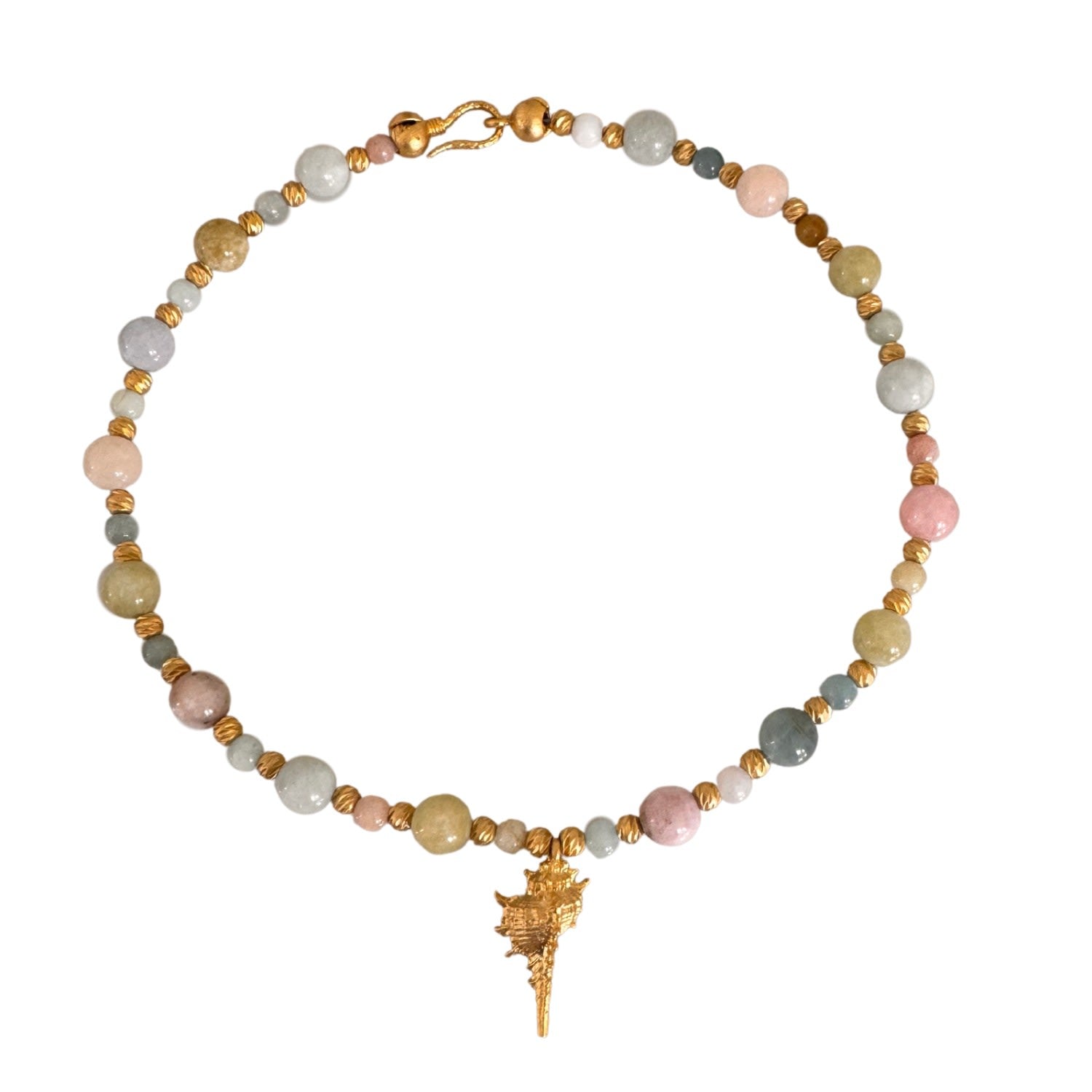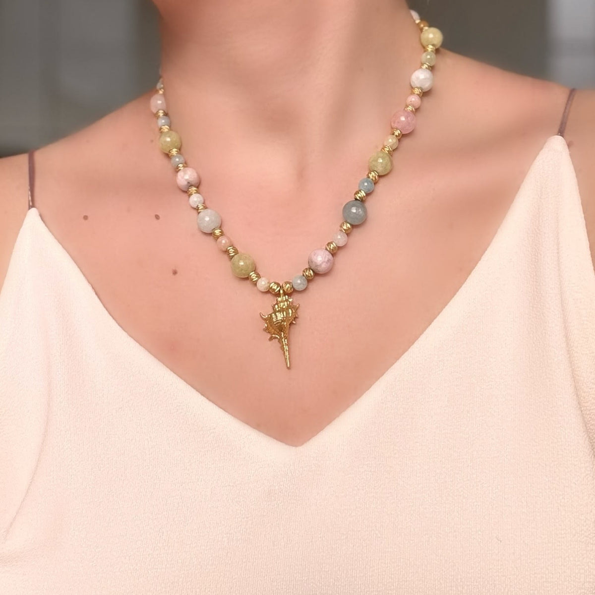 This beaded necklace is made from aquamarine heliodor gemstones and features a golden-plated seashell pendant.