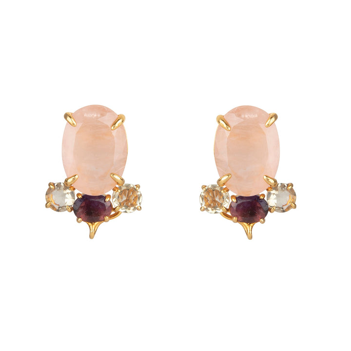 These stud earrings are crafted from 14K gold plated material and feature semi-precious rose quartz and amethyst stones.