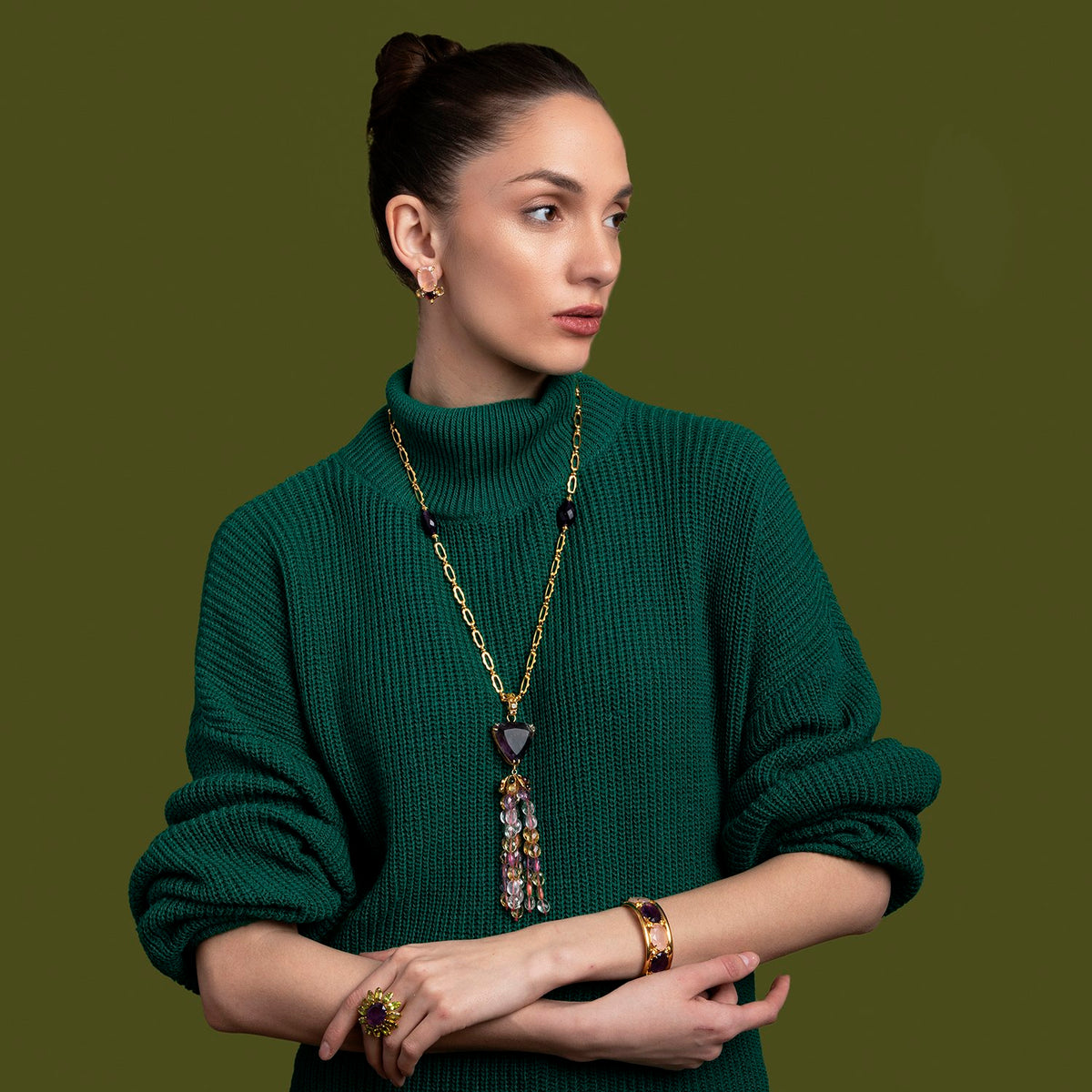 Bounkit is a luxury jewelry brand founded by Moroccan-born designer Hassan Bounkit in 2006, based in New York City. Known for its bold and vibrant designs, Bounkit specializes in handcrafted pieces that often feature semi-precious stones. The brand is particularly celebrated for its versatile, multi-functional jewelry, where pieces like brooches can be transformed into pendants, and necklaces can be worn as belts or bracelets. Each item is meticulously crafted in Bounkit's New York atelier, offering a blend of vintage-inspired elegance and modern-day functionality, making the jewelry a favorite among celebrities and fashion icons.