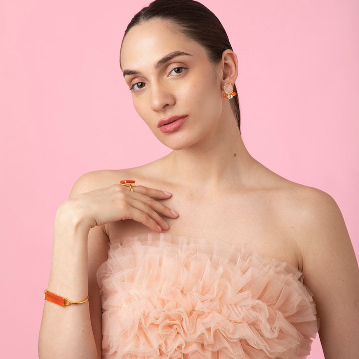 These stud earrings are crafted from 14K gold plated material and feature semi-precious rose quartz, blue quartz, and carnelian stones.