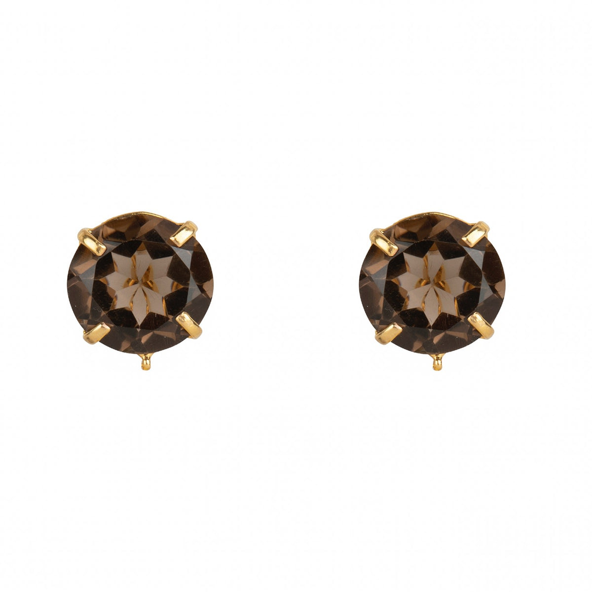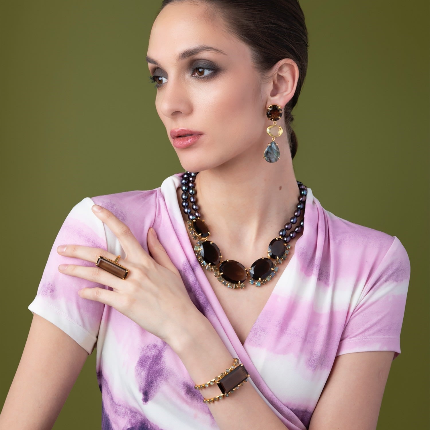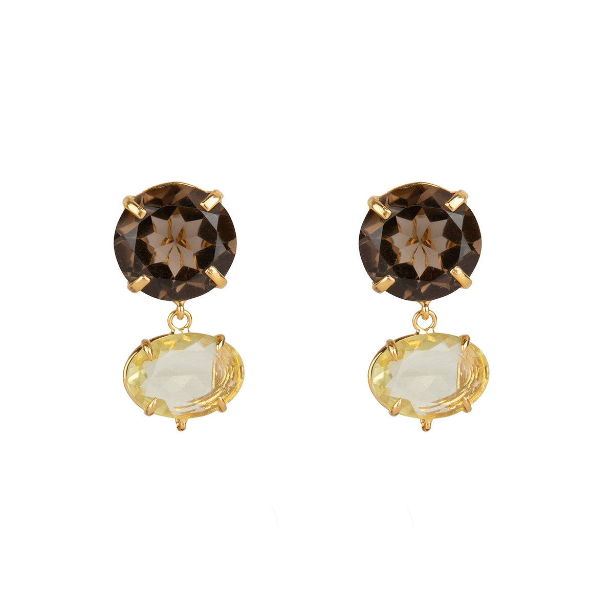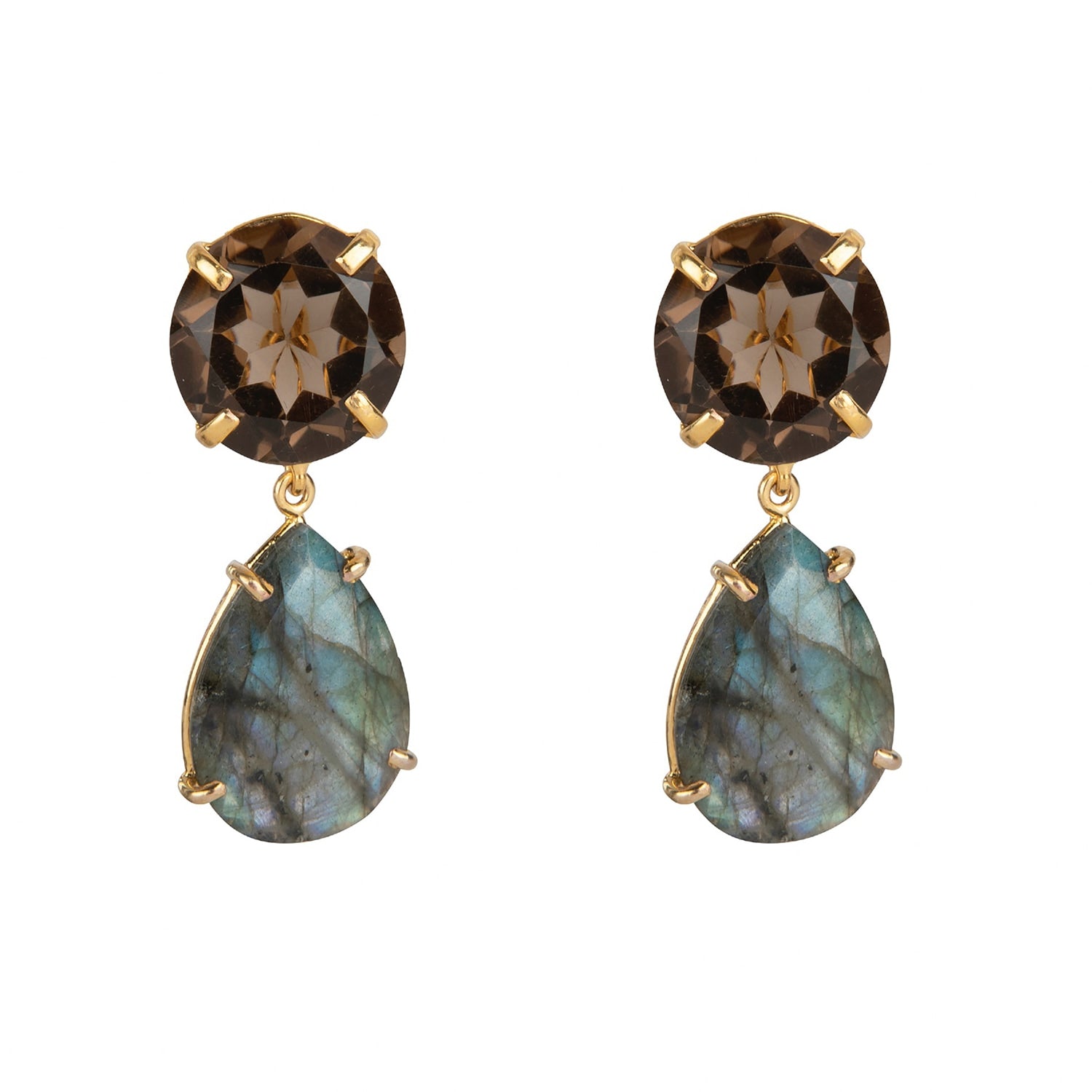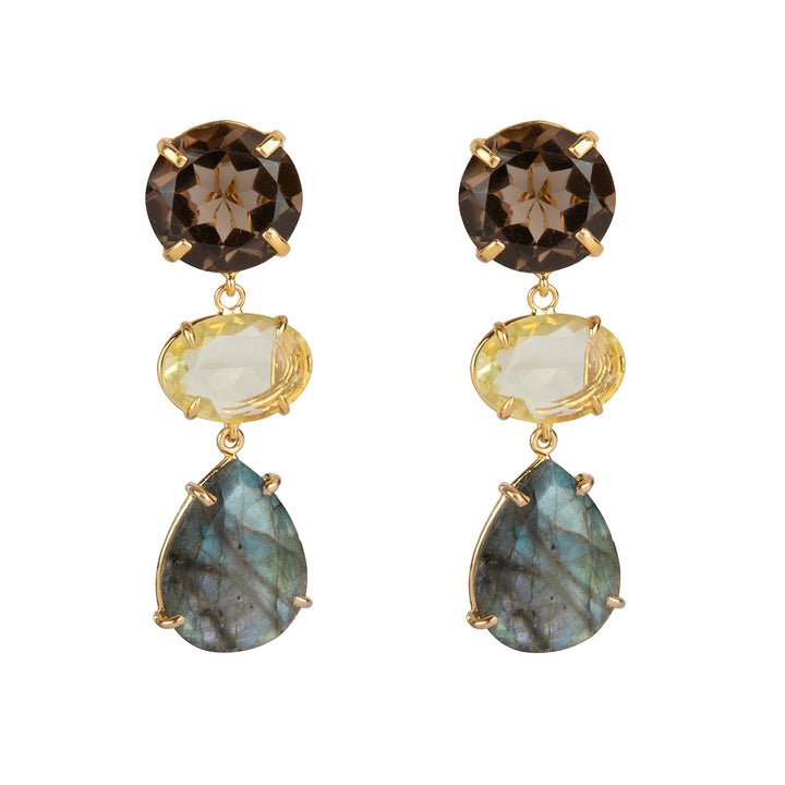 These dangle earrings are handcrafted in 14k gold-plated settings and feature smoky quartz, lemon quartz, and labradorite stones.