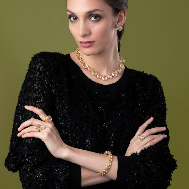 This cocktail ring is crafted from 14K gold plated material and features clear quartz stones. It has a resizable design.