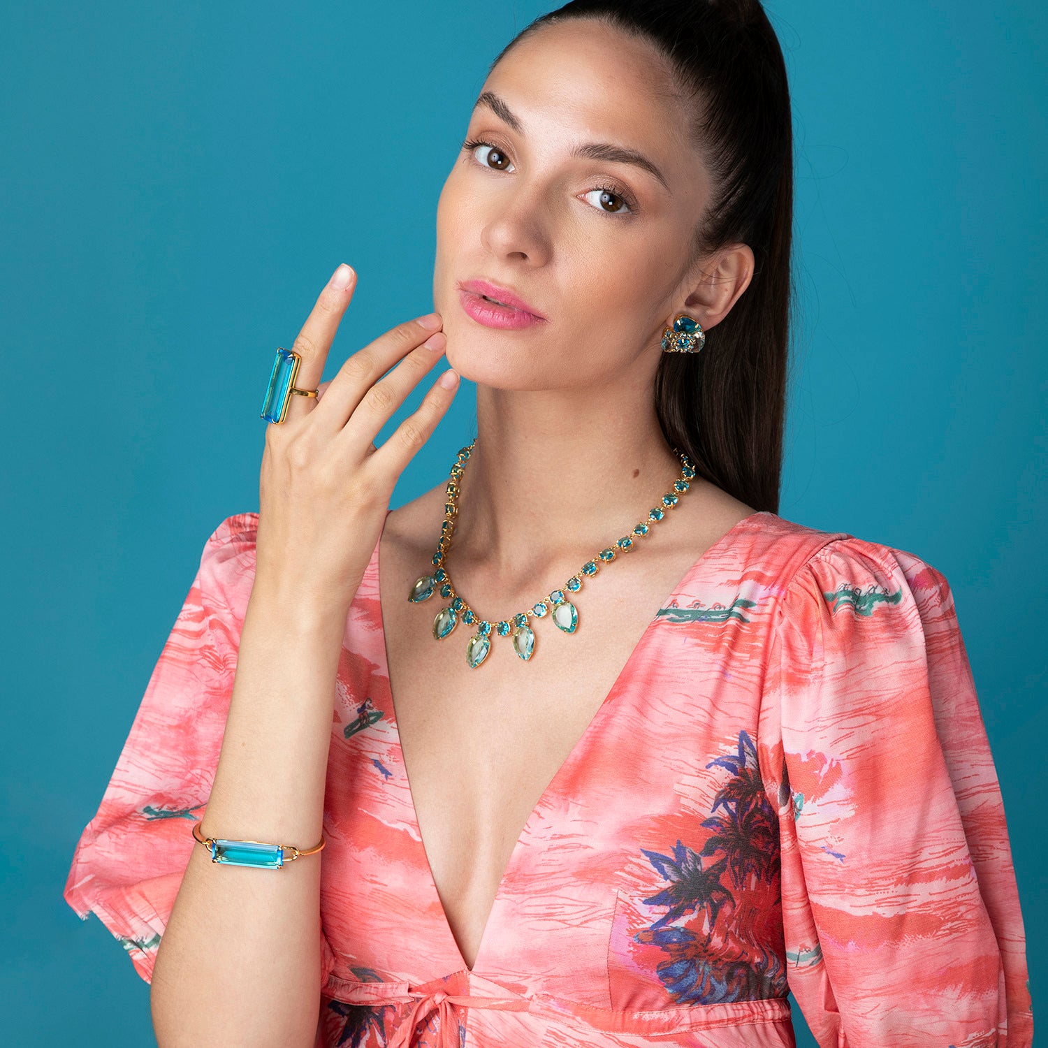 This Lucille Ring Blue Quartz by Bounkit is a modern and elegant cocktail ring. The long rectangular blue quartz centerpiece is designed to gracefully elongate your fingers, adding a touch of contemporary style. It’s a masterful blend of modern design and timeless elegance, perfect for drawing attention and becoming a focal point on your hand.
