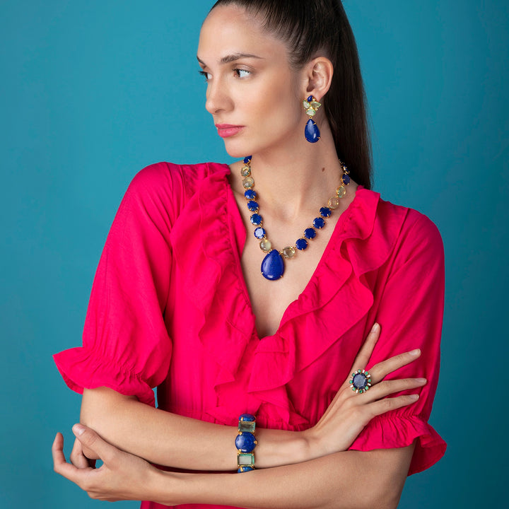 These Caroline Earrings by Bounkit are a captivating and artistic accessory. The carefully designed earrings feature a splendid combination of deep blue lapis and soothing green quartz stones. The removable drops allow you to effortlessly create a fresh and distinctive style, adding a touch of artistry and sophistication to your ensemble.
