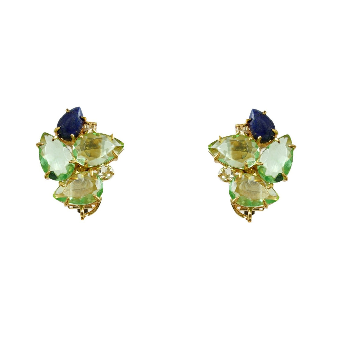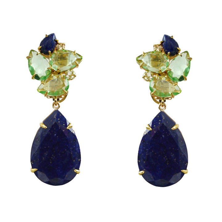 These dangle earrings are crafted from 14K gold-plated material and are set with lapis and green quartz stones. They have removable drops.