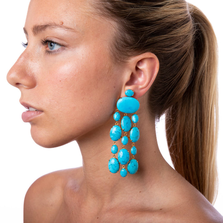 These chandelier earrings are crafted from 14K gold plating and feature turquoise.