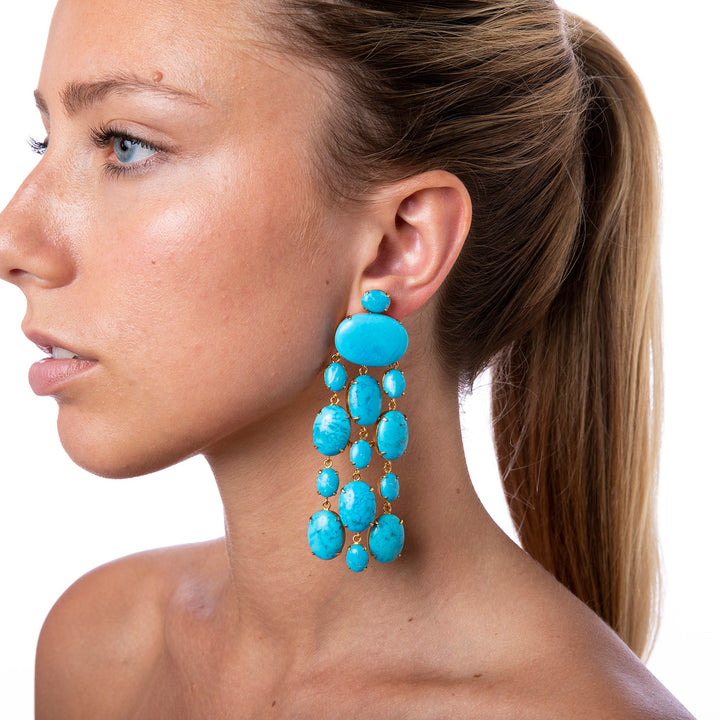 These chandelier earrings are crafted from 14K gold plating and feature turquoise.