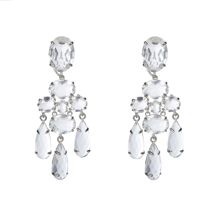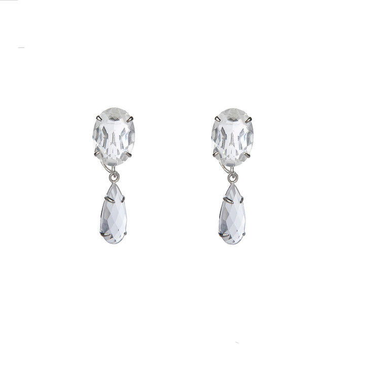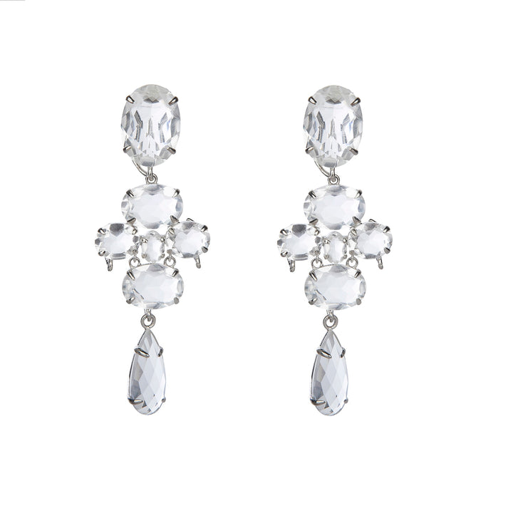 These earrings are made with clear quartz stones and are available in a silver finish.