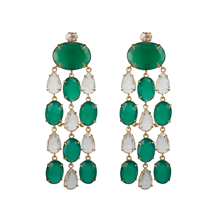 These chandelier earrings are made with green onyx. The specific metal is not mentioned, but they are an elevated version of the Marysol Earrings.