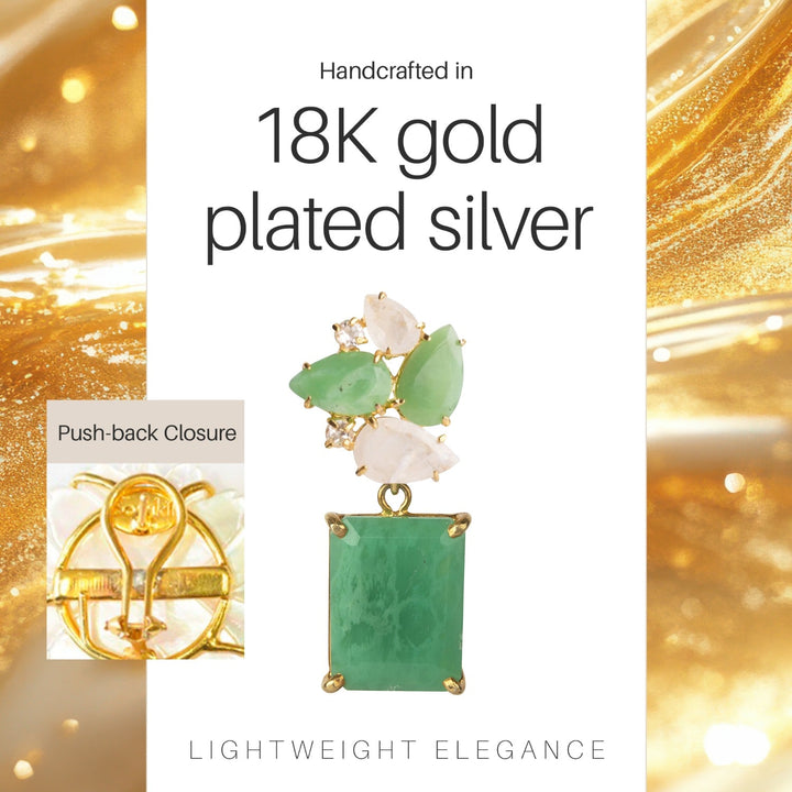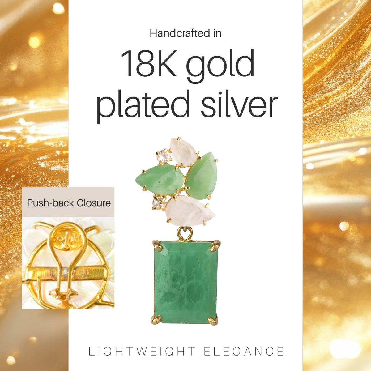 Handmade in New York, these earrings are crafted from sterling silver with 18k gold. They feature natural chrysoprase and white topaz gemstones. The omega post backing provides a secure and comfortable clip-on fit.