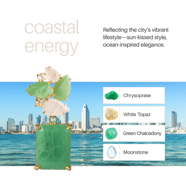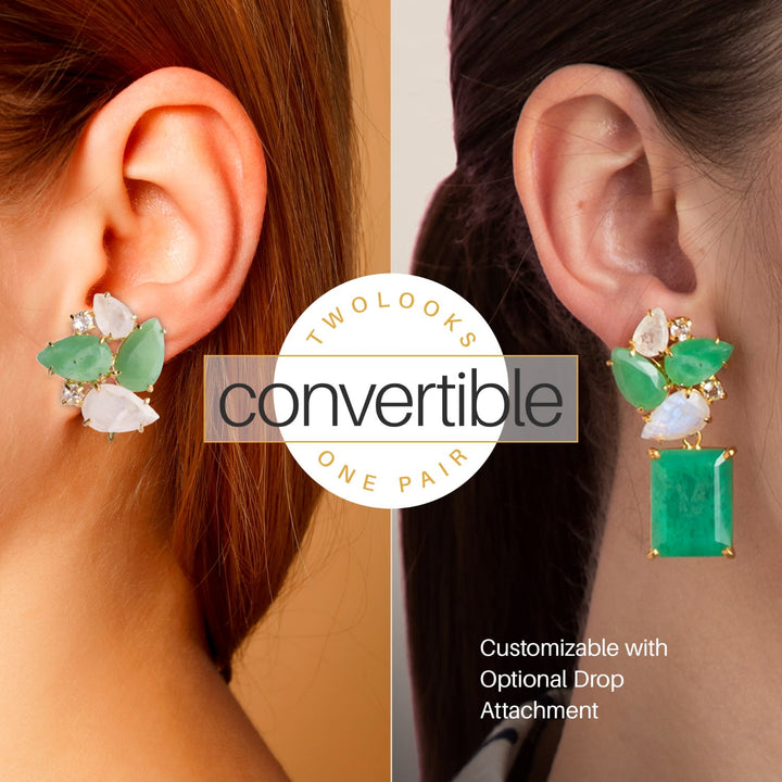 These San Diego Earrings Omega Post by Bounkit are a testament to the art of convertible, timeless elegance. They blend vibrant detail with a quiet sophistication, featuring stunning chrysoprase and white topaz. The design is versatile and chic, with a hidden hook that allows for the addition of drops, making them a perfect statement piece for any occasion. They are designed for comfort and lasting wear, making them a luxurious staple in any jewelry collection.