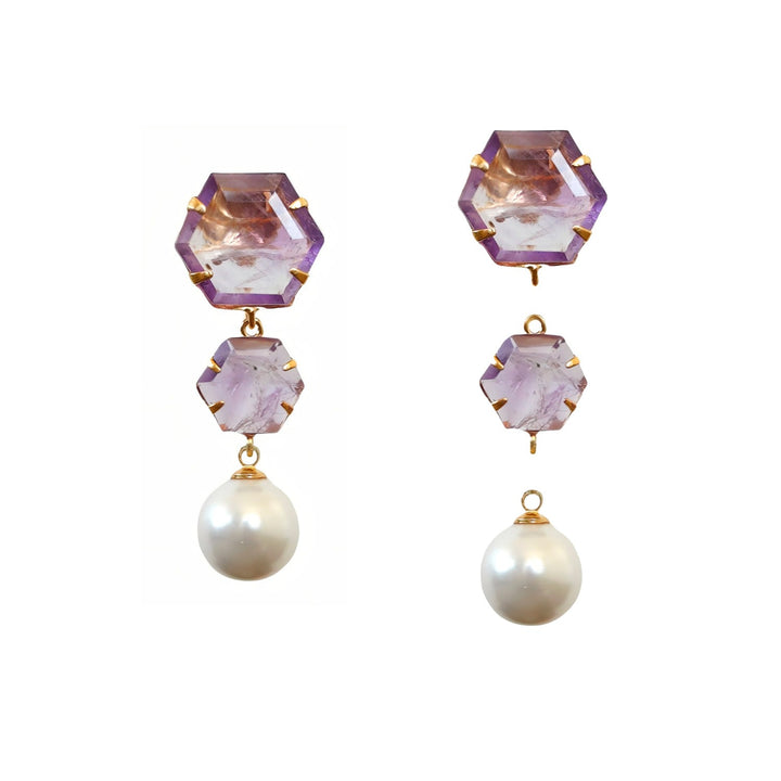 Handmade in New York, these earrings are crafted from sterling silver with an 18k gold finish. They feature natural amethyst and shell pearls.