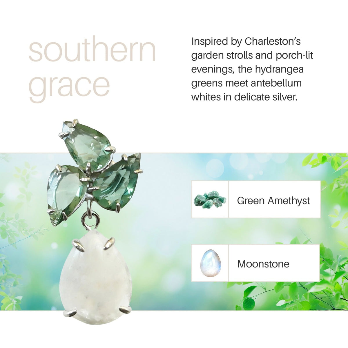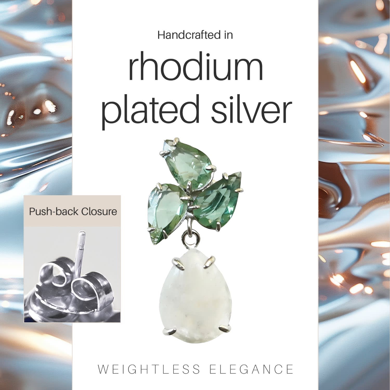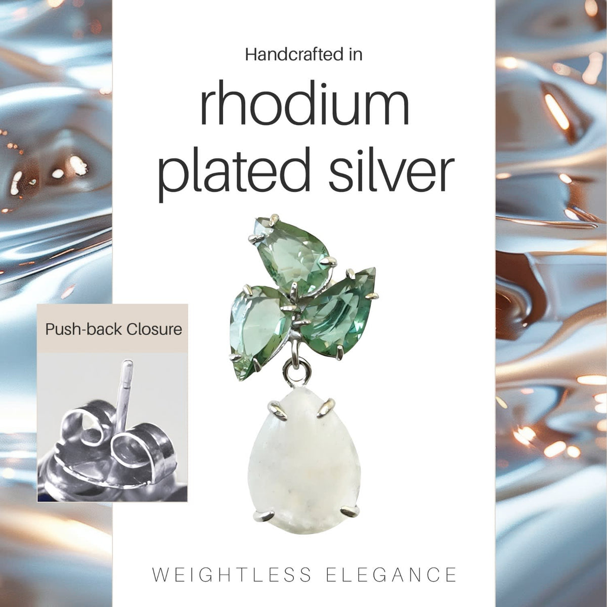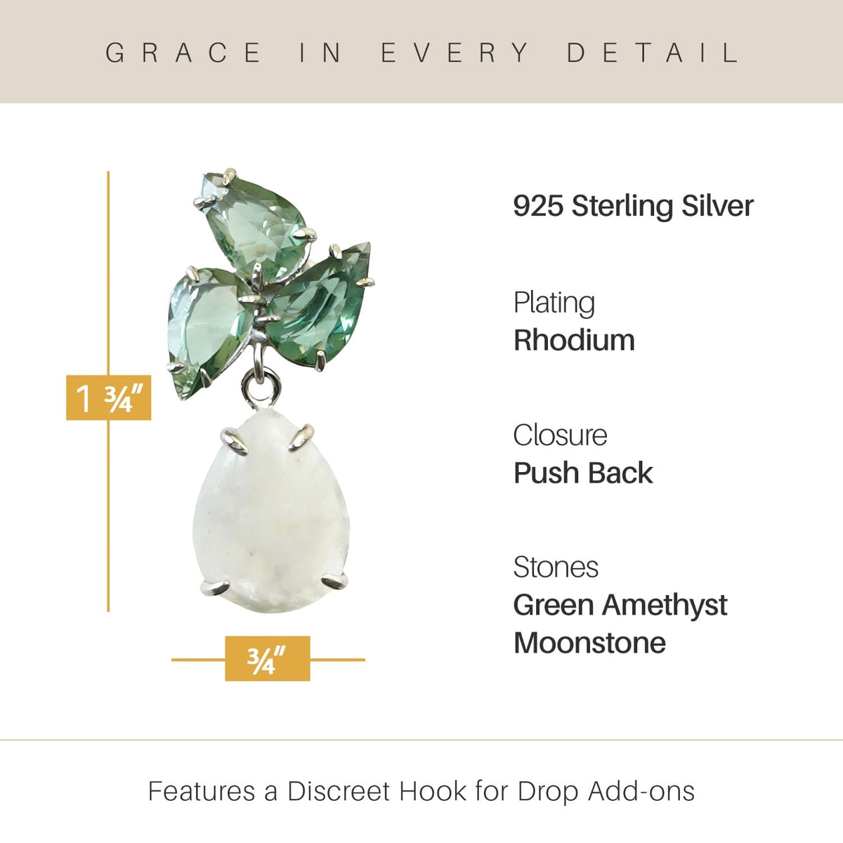 These earrings are handmade in New York from rhodium-plated sterling silver and are set with natural green quartz and moonstone.