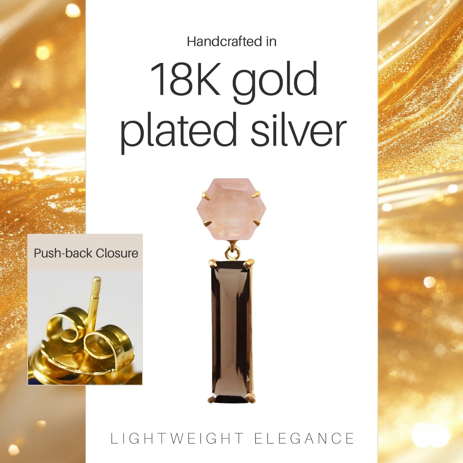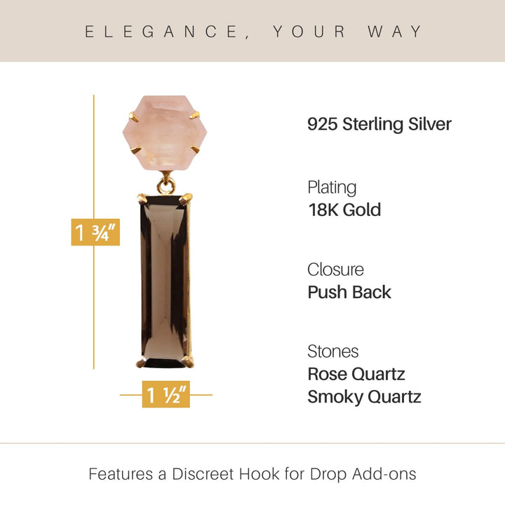 These push-back earrings are handmade from sterling silver and plated in 18K gold. They are set with natural rose quartz and smoky quartz gemstones.