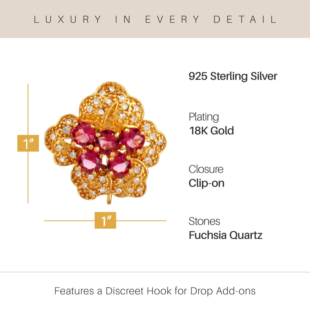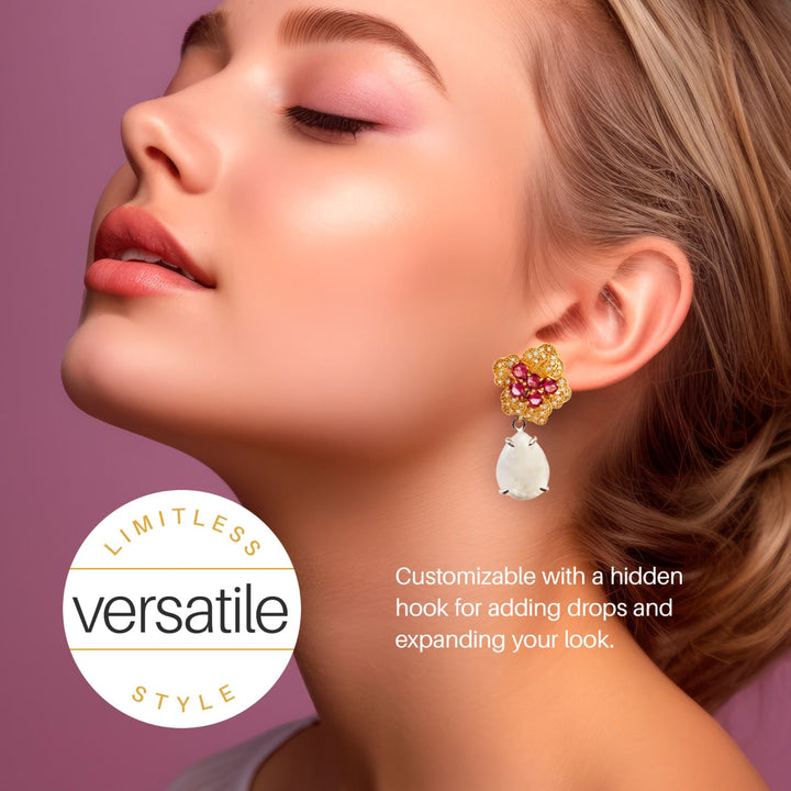 These Fuchsia Bloom Earrings by Bounkit are a vivid and charming statement piece. Their bold floral design, crafted from natural stones, adds a splash of color to any look. Handmade in New York, these clip-on earrings are lightweight and comfortable for all-day wear. The discreet hidden hook offers versatility, allowing you to add a drop for extra elegance. These earrings are an expression of confidence and craftsmanship, blending a modern hue with a classic, timeless form.