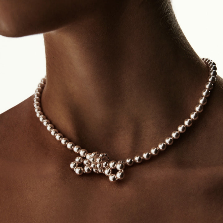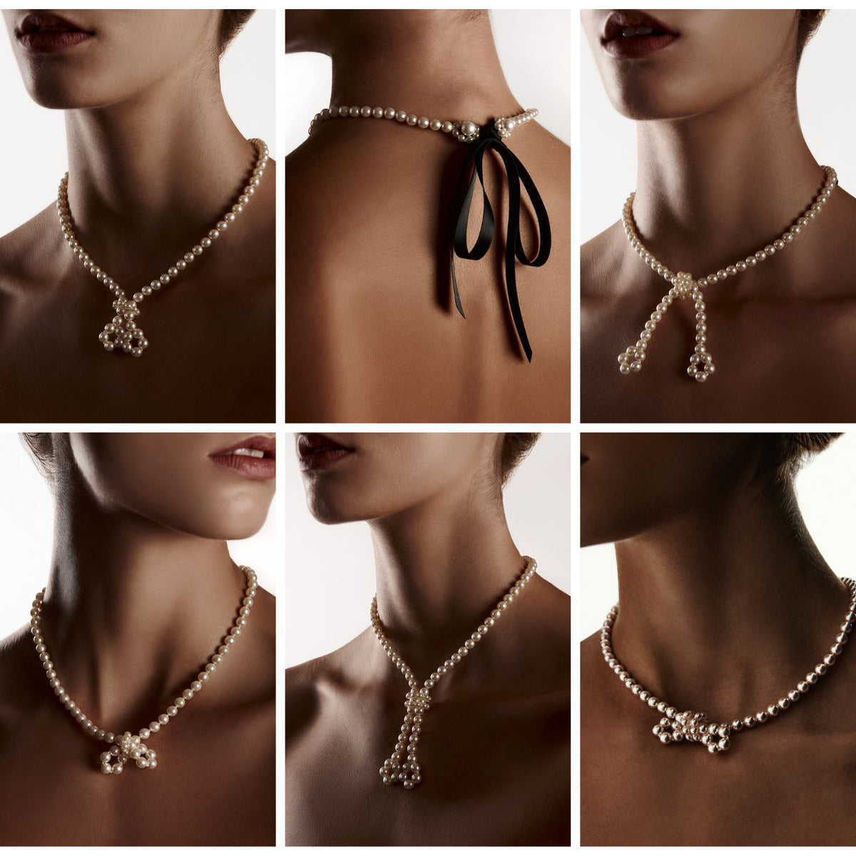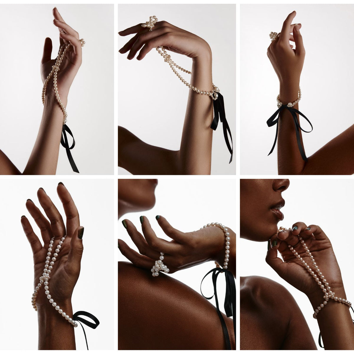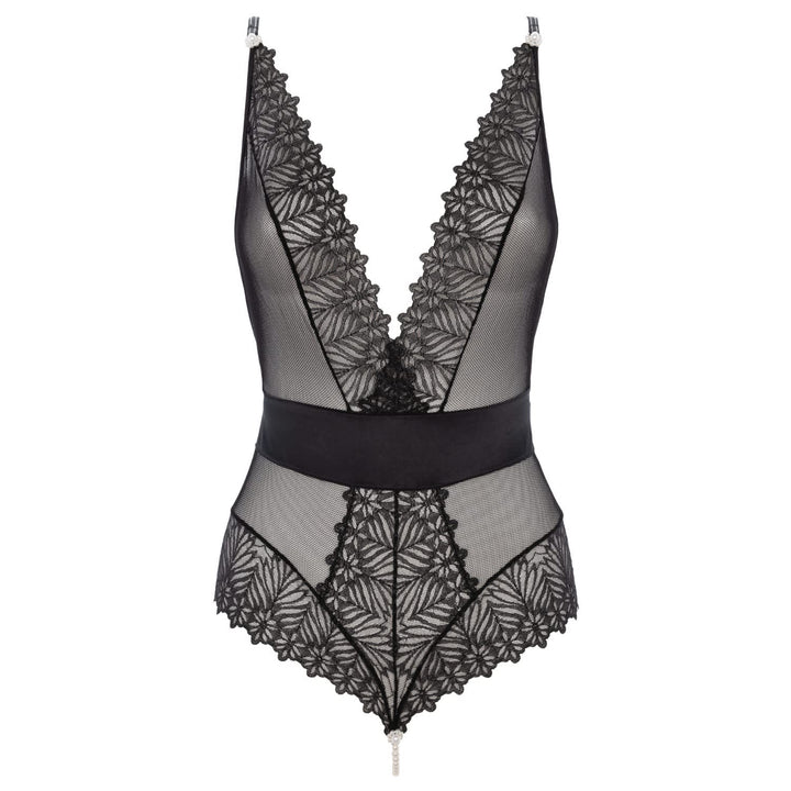 The Destinos Body - Black - Jewel Necklace by Bracli is a unique product that blends lingerie with jewelry. This versatile set consists of a body piece with a detachable string of pearls, two pearl bows, and two pearl rings that can be combined in many different ways to create necklaces, bracelets, and stimulating lingerie garments. It's designed for both public and private enjoyment.