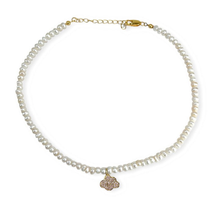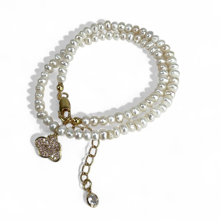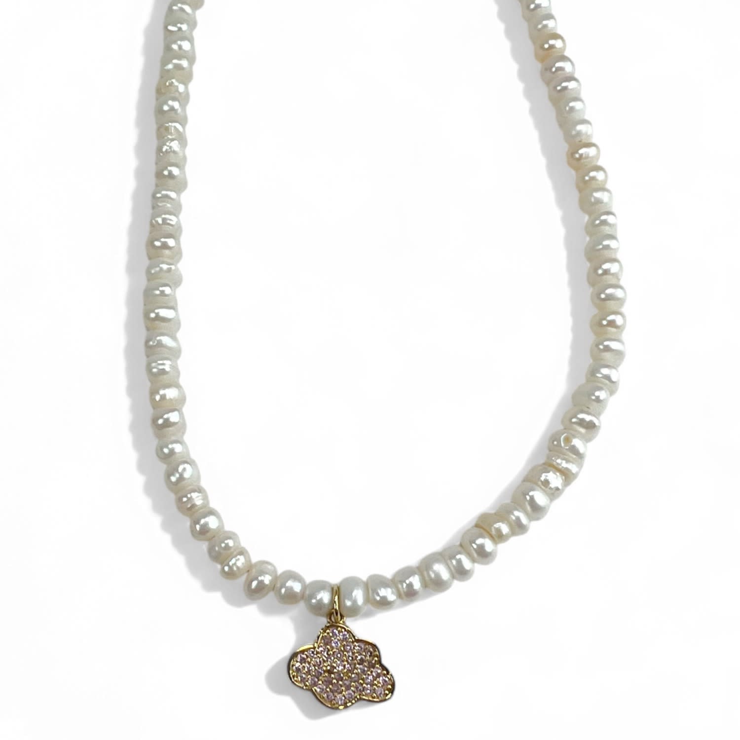 This beaded necklace is crafted from freshwater pearls and gold-plated brass. To maintain its quality, avoid contact with water, perfume, and chemicals. Store it in a dry place.