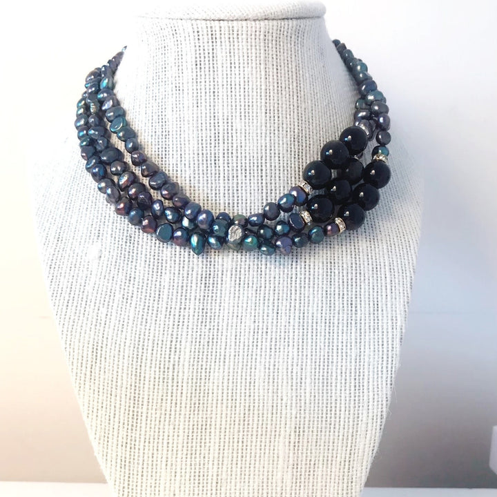 This choker necklace is handmade with three strands of natural cultured freshwater pearls and black onyx beads.
